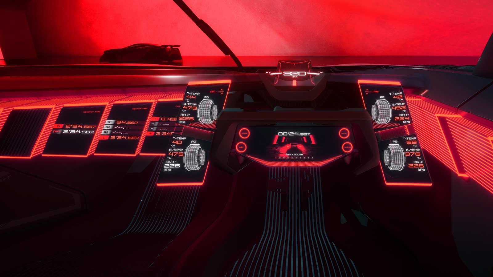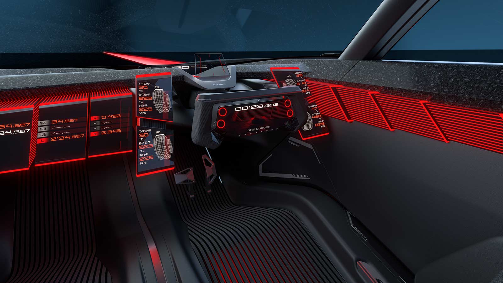 In R mode the cabin illuminates in red and creates an intuitive cockpit centered around the driver to support concentration. Panels on the dashboard extend toward the seating space to enhance the cockpit feel around the driver. Meanwhile, four satellite screens around the steering wheel display tire grip and temperature, air pressure, brake rotor temperature, power distribution and other information invaluable for racing.