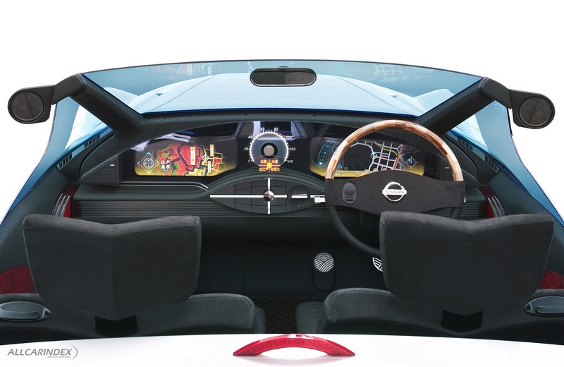 Inspired by the dashboard in the original Datsun Roadster, the instrument panel is rendered in a simple fan-shaped surface construction that incorporates cylindrical instruments.
