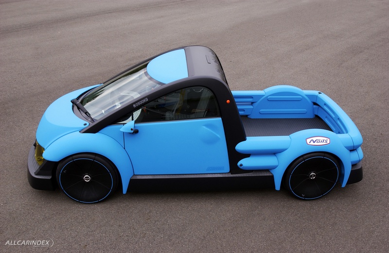 The pickup styling of the Nails concept features a unique construction formed by placing an A-shaped cabin frame on the low floor that runs from the cabin along the length of the bed.