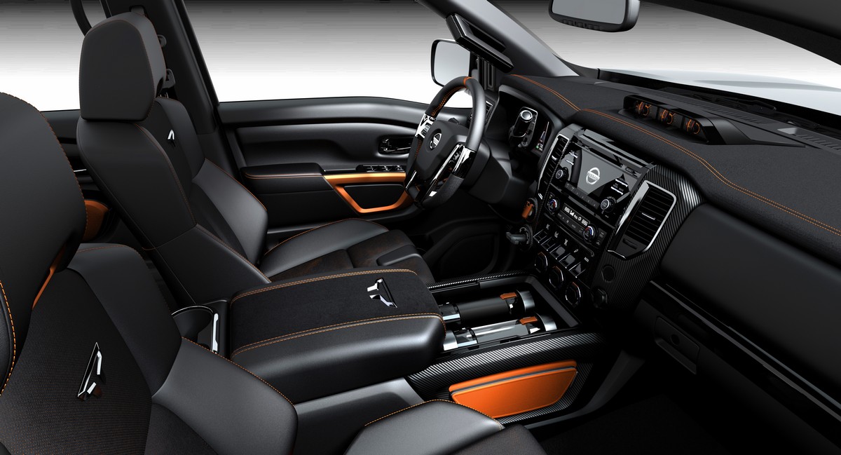 The interior design team at Nissan Design America wanted to give the vehicle a unique polished "chronograph" look and feel, focusing on materials and detailing while remaining true to the TITAN Warrior Concept's active performance theme. For example, the seats are covered in a carbon-colored high-strength seat fabric trimmed with "Magma" orange accents. Interior surfaces utilize material, such as carbon fiber, polished chrome finishes, leather with accented Magma orange stitching.