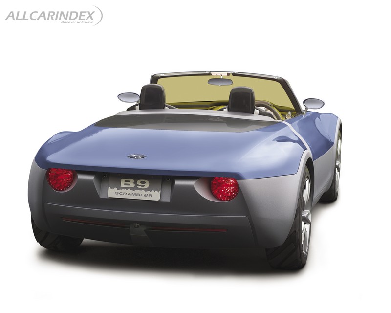 Supervised by the Chief Designer at Subaru's Advanced Design section Andreas Zapatinas, the B9 Scrambler's styling follows the Subaru B11S introduced at this year's Geneva Show, and is a design study to obtain Subaru's at-a-glance styling identity. The styling, free from stereotypes regarding body dimensions and tire sizes and existing limitations, is advanced yet give somewhat familiar feelings. The design elements found on the B9 Scrambler suggest Subaru's design trends in the 21st century. The face design utilizing air intake and wing motif suggests Subaru's heritage as an aircraft manufacturer. The large wheels and wheel arches indicate superb performance. The side view featuring wedge shape stirs the driver's blood. The interior, especially the dashboard is unified with the motif of wings.