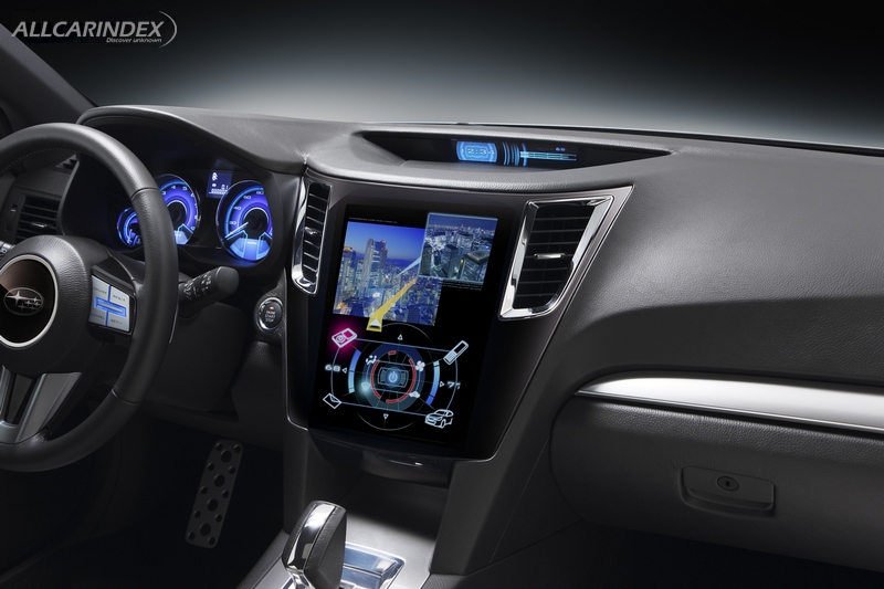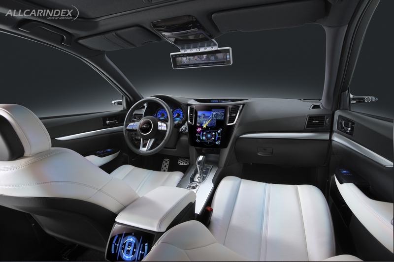 The concept behind the interior design is "High Definition". A striking four-seat layout has been adopted in order to provide enough space to fit four adults in comfort and style. The combination of a roof design that provides a feeling of freedom with the expansive legroom delivers a vehicle that can be truly classified as a global mid-size sedan without losing its sporting pretensions. For the seats, Pearl White leather with a blue sheen has been adopted, while Black metallic leather has been used for the door trim to create a luxurious contrast with the instrument panel. The center panel features a large touch-panel display that concentrates the various functions to provide ease of use, while the adoption of a cylindrical-shaped design that extends vertically emphasizes feelings of strength and solidity in union with the exterior. A steering wheel and shift lever have been adopted to accentuate the sporty aspect that is elemental in the Legacy Sedan. The monitor of the Side Rear Vision Camera has been situated towards the front of the roof in order to maximize rear visibility. For interior entertainment, monitors with entertainment functions have been located in the center panel and rear surface of the center console, as well as in the rear of the front seat headrests in order to provide comfortable functionality as well a calm design that creates a relaxed ambiance for the four adult passengers.