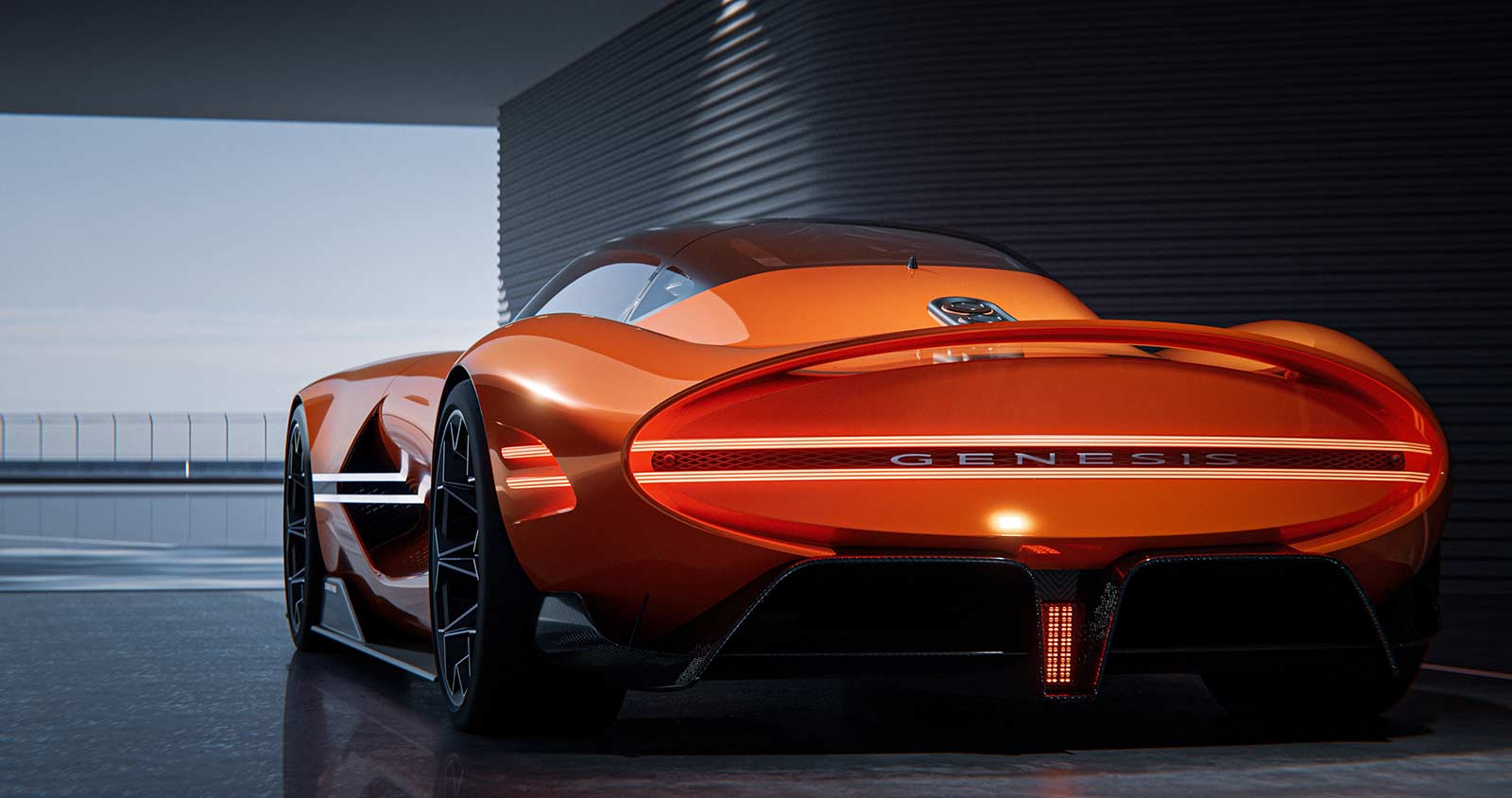 The fuselage extrudes towards the rear, culminating in an elliptical concave volume, which is common to Genesis vehicles. It is framed by a rear spoiler and lateral trailing edges for aerodynamic high-speed stability. The contrast of energetic body sculpture with technical aero details creates the ultimate expression of grand touring spirit.