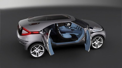 The concept car's two-tone chocolate and blue interior exudes a sense of well-being and conviviality. The fully glazed roof floods the cabin with light, while the enveloping forms of the staggered slim-line front seats provide first class comfort and support. The driver's seat is incorporated in a structure which extends all the way from the sill to the centre console, forming a sculptural, one-piece ensemble that echoes the exterior's sporty appeal.