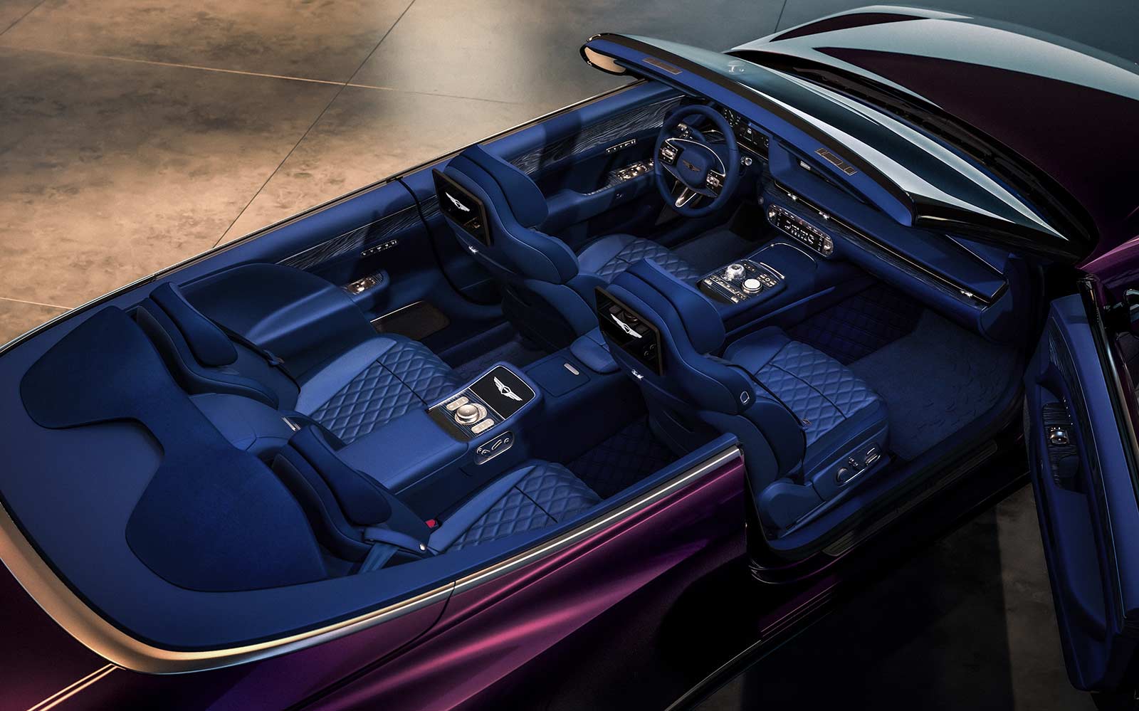 The crystal elements also elevate the sense of luxury while bringing warmth and depth to the cabin experience in the X Gran Convertible Concept. Paired with the soft materials of the seats and carpets, the crystals create a monochrome effect that highlights the grape blue tones of the interior.