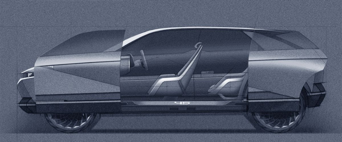 By exhibiting a modernized fastback profile, 45 epitomizes stability and dynamism, characteristics accentuated by the vehicle’s significant width and forward-oriented posture. The precise, yet energetic factors of the exterior are delivered throughout the cabin, which is structured by a dynamic daylight opening (DLO). The DLO terminates in the fast angle of the C-pillar, which generates a feeling of dynamic forward motion, even when standing still.