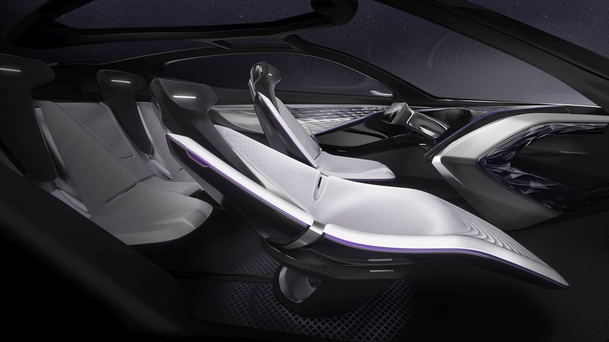 The Futuron’s seamless interior also reflects its autonomous driving nature, with surfaces flowing uninterrupted from the dashboard and through the door panels. The doors feature the same Star Cloud lighting and scaled Dragon Skin motif found on the outside of the car, creating a glittering interactive ambient lighting system. The ventilation system is also housed behind Dragon Skin scales, which open and close to allow fresh air to circulate throughout the cabin.
