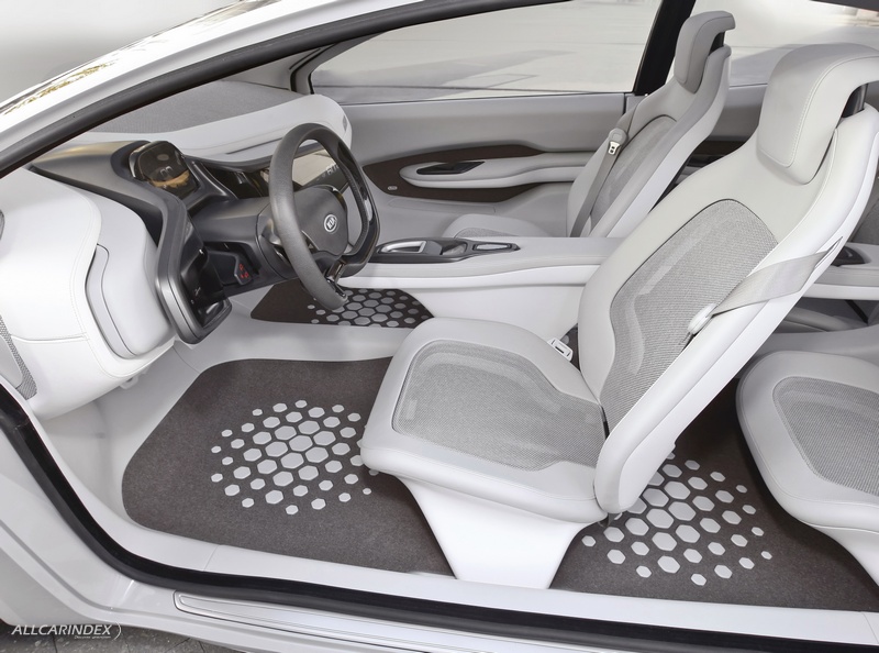 EcoDynamics is the overarching design philosophy applied to make the Kia Ray concept efficiently functional and striking in appearance. A lowered mono-volume shape and a strong, curvaceous silhouette gives the Kia Ray concept better aerodynamic properties than taller profile hybrid vehicles. Strong and lightweight materials are used to support the EcoDynamics philosophy starting with a tabbed LED Kia badge covered with a single piece of glass that extends over the hood and another piece of glass that extends from the cowl of the windshield to the rear header to offer occupants a spacious, airy feeling. An illuminated battery charge indicator display is hood-mounted, furthering the Kia Ray concept’s futuristic design. A tapering greenhouse cabin and a longer “tail” improve aerodynamics while reduction of drag is attained through a one-piece, smooth-as-glass, integrated underbody panel, narrow tire width and flush wheel design. Front driving lamps slide back to create openings for better air intake when the gasoline engine is being used and a sliding U-shaped deck-lid extends from the rear of the vehicle at higher speeds for improved coefficient of drag. In lieu of side-view mirrors and door handles, motion-detector cameras are mounted flush with the body for safe lane changing procedures and opening of doors. The result is an airframe on wheels. The front door opening features a forward cutout design for the feet allowing ease of entry. The rear door lines are very purposeful with rear-hinged coach doors, yet stylish because their height and shape improves ingress and egress.