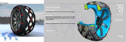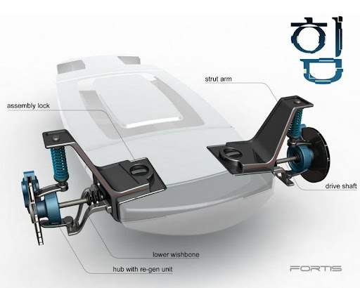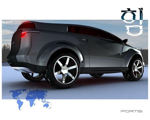 Fortis has the aggressive stance expected of a highly capable SUV combined with such fresh aesthetic touches as light clusters influenced by Korean glass sculpture. Far more contemporary still are the bumper sections, doors, bonnet, front wings and rear hatch which are manufactured from recycled tyre rubber. Underpinning all this machismo is a modular chassis and drivetrain concept that will be developed through subsequent designs, the platform allowing for different vehicles to be easily packaged around common parts.