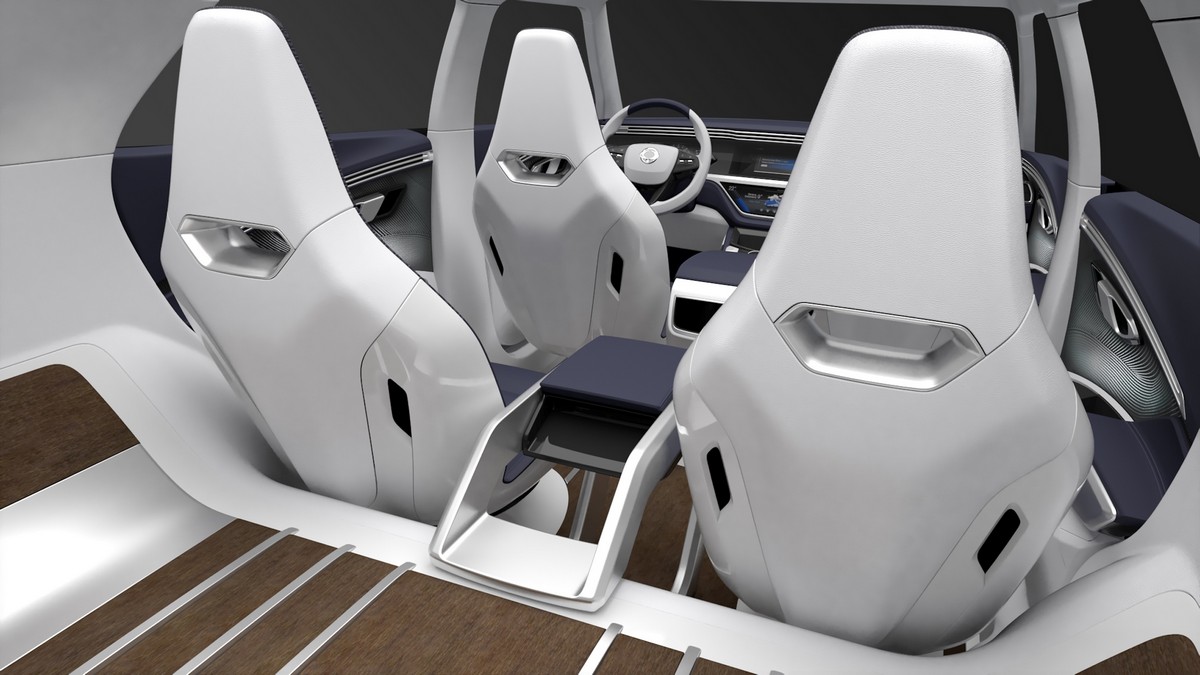 Materials and tones are taken from the world of high-end interiors, and include a woodgrain floor to give a sense of the elegance experienced from being on-board a luxury yacht, soft texture materials and an overwhelming sense of refreshing space. The tone of luxury is furthered by Alcantara, premium Italian suede to the headlining and pillars, while subtle interior lighting is emitted to accentuate the wood, steel and seating for a feel of enhanced refinement.