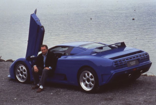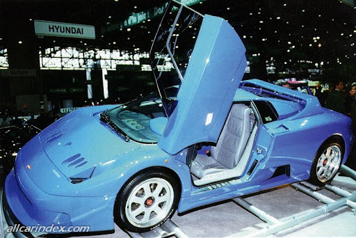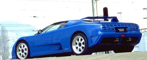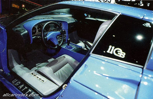 The body has been modified and redesigned: the front skirt is more aggressive and holds a large air-intake for the radiators. The traditional, horse-shoe shaped radiator form seen on all classical Bugattis, is used as another air-intake for the air-conditioning in the front hood. The ultra modern triplet projector lights are aerodynamically recessed and covered by glass. The rear view mirrors, mounted quite prominently on the original, now follow the flow of the cockpit. The rear mounted air-scoops allow enough air to the tuned engine. The rear wing guarantees plenty of down force and optimal aerodynamic for the top speed of more than 350 km/h. Its middle section is electronically adjusted in its angle in relation to the speed. The newly created rear end of the car, functional in its design, rounds up the compact lines of the EB 110 "Cyan". For this conceptional vehicle especially, which already has found its buyer and new owner, the Swabian wheel manufacturer BBS has developed new three piece aluminum wheels. As an obvious quality, the bolts, holding the three elements together, are mounted from the rear and therefore are hidden to the eye. The outer rings are polished in a high gloss finish. The dimensions, of the in the classical Bugatti design created wheels, are impressive: 9½ x 18" in the front an 13 x 18" in the rear. The Italian tires producer Pirelli supplies the unusual sizes of the P Zero of 245/40 ZR 18 in the front and 325/30 ZR 18 in the rear.
