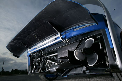 The transformation starts with the nondescript rear panel, which flips up to reveal a Z-drive in horizontal rest position, borrowed from a watercraft. The Z-drive is fitted with a conventional 3-bladed propeller and can be lowered to its fully ‘standing’ position from the cockpit. The position of the drive is infinitely variable, which guarantees immediate propulsion upon entering the water. A custom-designed transfer case sends power to the rear wheels, the propeller or both, depending on the input from the pilot. Starting at a water depth of about 1.1 meters the Z-drive can be lowered all the way to its fully ‘standing’ position. Steering commands are entered via the steering wheel and transferred to the Z-drive.