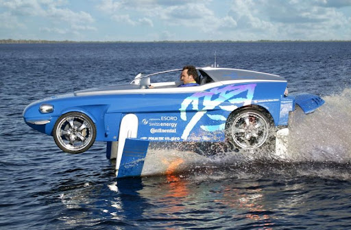 Under the ultra-light carbon-composite skin lies much more than just an agile and lively sports car. The Rinspeed “Splash” is the true incarnation of a really cool and fun sports toy. At the push of a button a cleverly thought-out hydraulic mechanism transforms the sports car into an amphibious vehicle. But that alone wasn’t enough for Frank M. Rinderknecht (48), founder and boss of Rinspeed. A highly complex integrated hydrofoil system enables the “Splash” to ‘fly’ at an altitude of about 60 cm above the water.