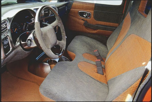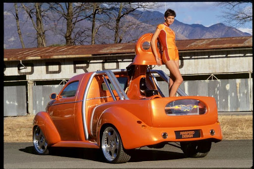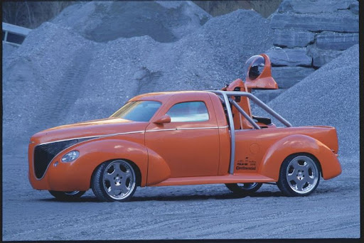 The front and rear fenders with their generous sweeping lines just barely cover the extra-wide tires. The windshield and side windows are very low compared to contemporary production cars. These observation slits harken back to the hot rod era. The doors are completely free of attached parts, with the exception of the rearview mirrors required by law. Door handles have been replaced by a remote-controlled electromagnetic opening mechanism. The truck bed is also free of attached parts. Wide side skirts and modern light units provide the only visual clues that the vehicle is in fact a synthesis of old and new. The tailgate is a real novelty. It is essentially a frame with a transparent and indestructible Lexan plate in the center. The tailgate lends a much lighter appearance to the vehicle's rear and gives stylists unprecedented design freedom.
