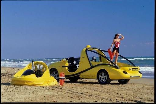 One of the world’s smallest, yet functional hovercraft is loaded as a special "presentation cargo" on the Rinspeed X-Trem. This air propeller driven and hovering fun vehicle can be piloted easily over all kinds of surfaces: water, land, sand and snow.