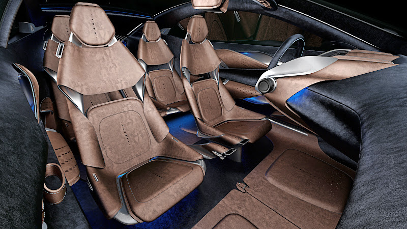 Inside, the deliberate use of non-automotive standard materials generates a uniquely soft, cocooning ambience. The extensive application of velvet-like Nubuck leather contrasts with the concept’s hard, hi-tech equipment. The exposed leather reveals a sandwiched accent layer, more akin to high-end furniture, while the car’s interior bright ware matches that of the exterior with the addition of a gold ‘pin striping’ element on the edging.