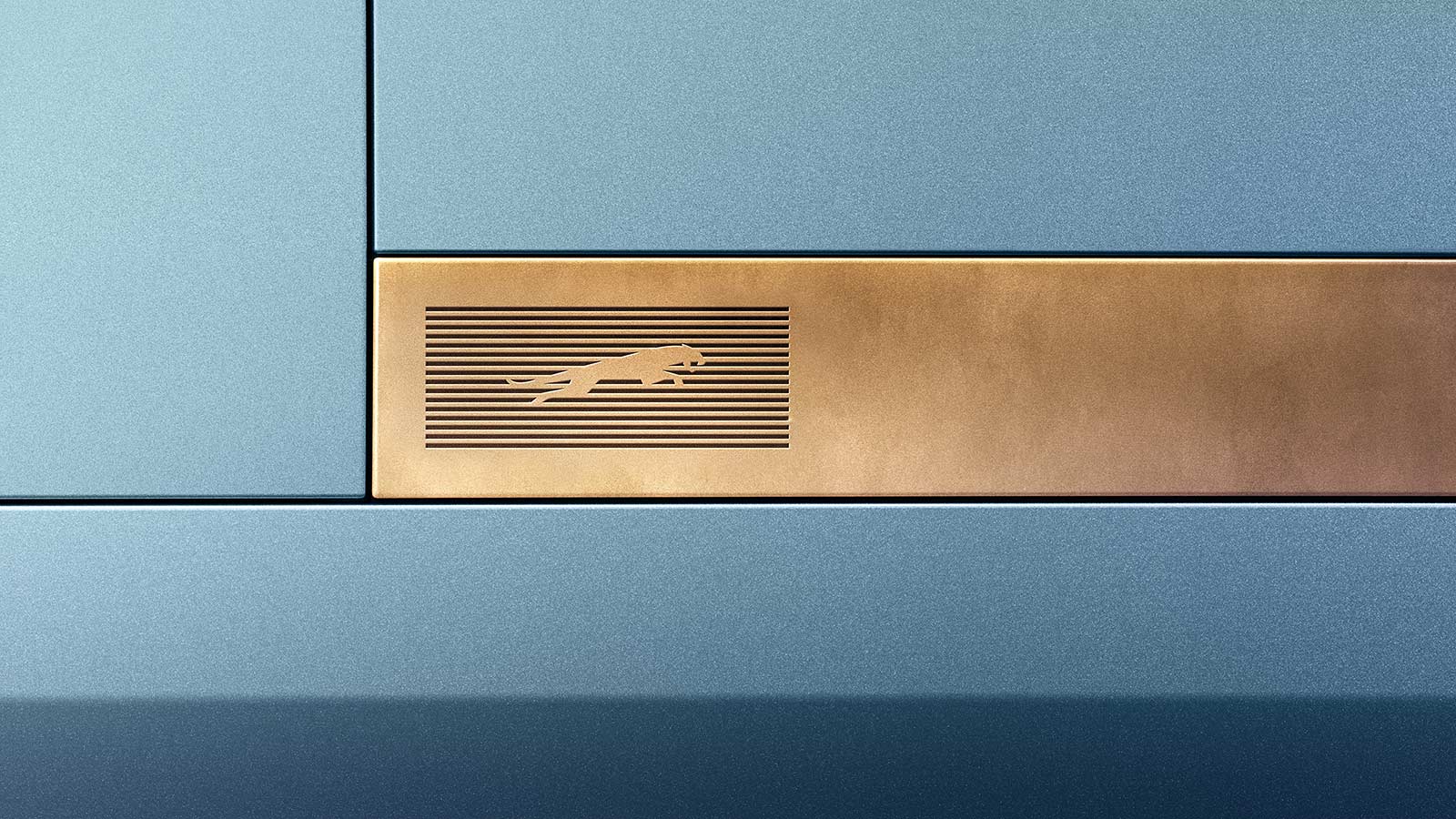 The side profile is dominated by bold proportions, with the Jaguar ‘leaper’ laser‑etched into a hand‑finished brass ingot on each side of the car. These ingots theatrically deploy to reveal rear‑facing cameras that – like the charging ports and front air intakes – remain hidden until needed.