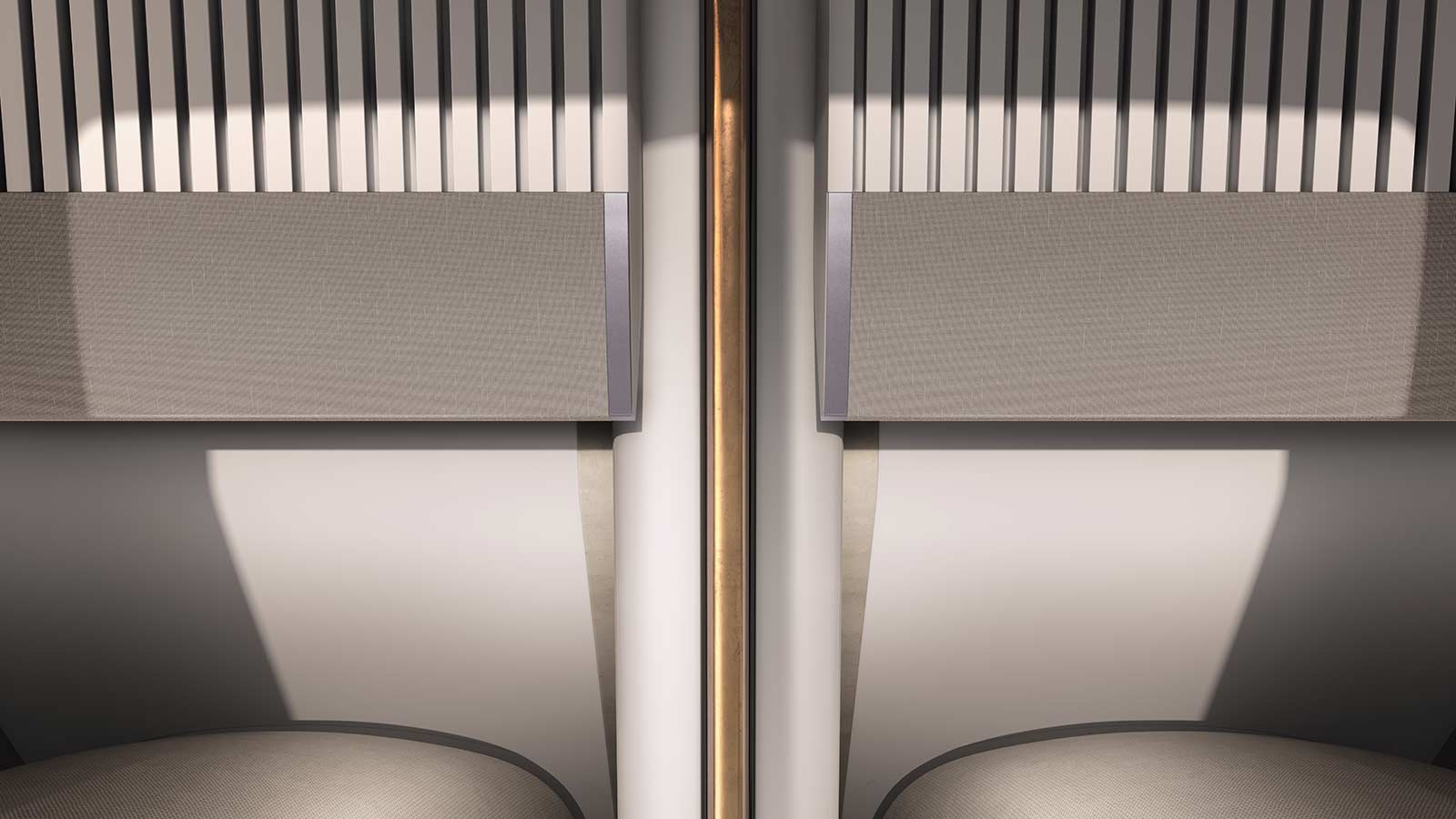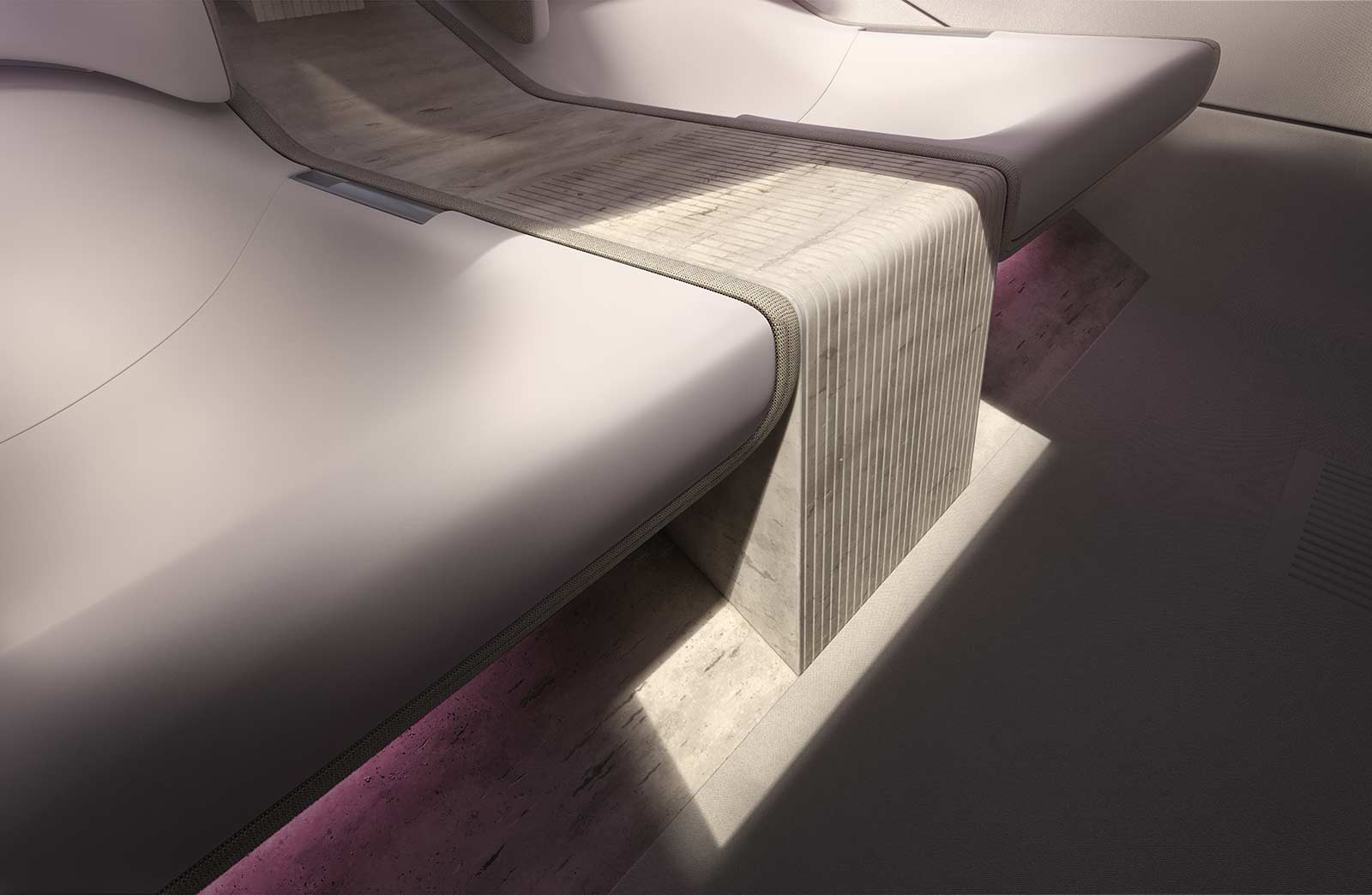 Soothing travertine stone functions as a plinth, supporting the floating seats and central spine. It inspires the rich layered tonal colour palette of the interior. Woven textiles add to the sense of craftsmanship. A tactile wool blend, inspired by handwoven yarns, envelops the two seats, sound bar and flooring.