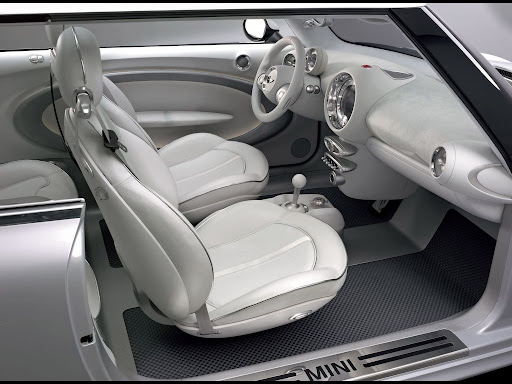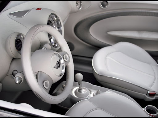 Throughout the interior, white leather underlines the impression of modern style and generous space, adding a strong touch of sophisticated class and stylish flair. The colour white emphasises the clear lines of MINI Concept Frankfurt, top-quality leather being used on different surfaces, the warm, natural surfaces being supplemented by cool-looking, metallic trim at all appropriate points. An aluminium-coated glass-fibre structure, for example, accentuates the door panels and linings inside the car, while a special carbon-fibre look highlights the foot area in combination with nylon texture carpeting adding a particular touch of sporting style.