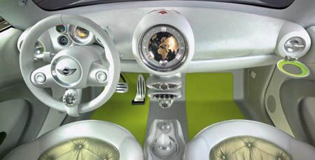 Satellite Silver serving as the interchanging silver and grey multi-layer paintwork, white and green leather with constantly changing surfaces and a different feel ranging from rough leather all the way to the seat bottoms and backrests in Chesterfield pattern, innovative glass-fibre tissue and a carbon look on the inner door panels as well as metallic glass-fibre optics in the footwells – all this clearly shows what travelling in genuine British style means to MINI at the beginning of the 21st century. Indeed, the very name 'MINI Concept Tokyo' stands for an exceptional ambience and the clever use of space.