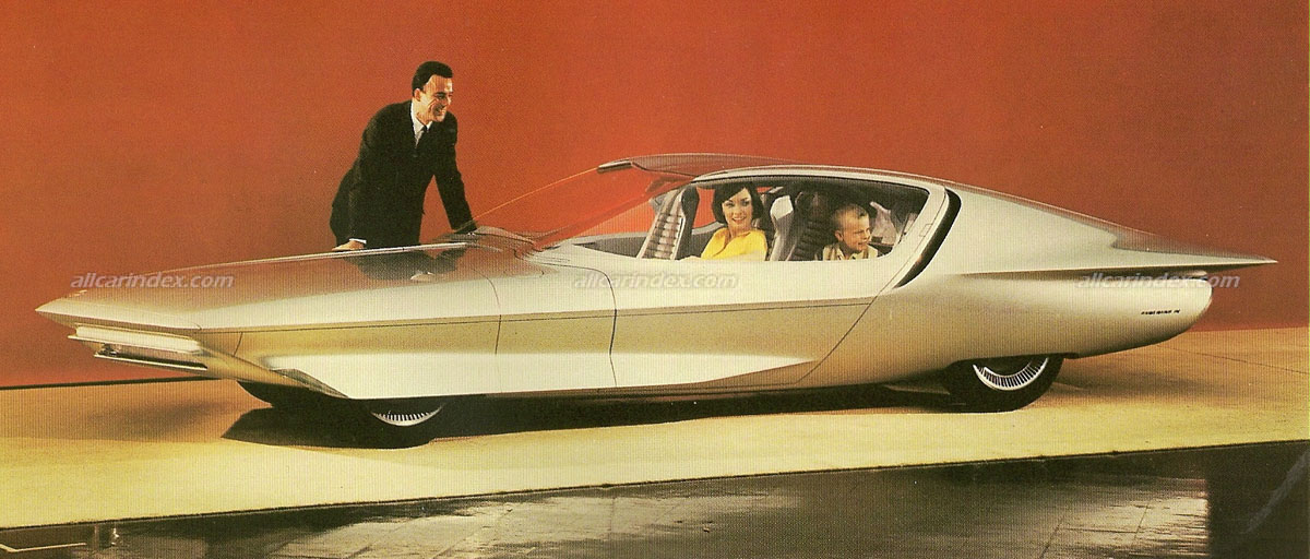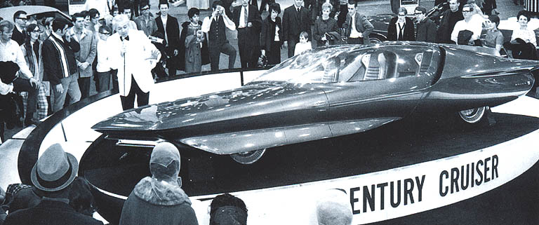 Buick's Century Cruiser concept car was designed for cruising on automated highways in the distant future. The experimental vehicle offered hands free driving, swivel contour seats, a refrigerator and TV set. When the Century Cruiser entered the expressways, a punched card with programmed routes would take over, piloting the car to the correct destination by information transmitted from electronic highway centers. The car’s progress could be watch on a strip map projected on a radar-like screen built-into the front console. The prototype could be manually operated via pistol grips positioned in the armrests for steering and speed regulation. An entrance canopy slid forward and upward, permitting doors on each side to glide ahead and allow passengers to enter.