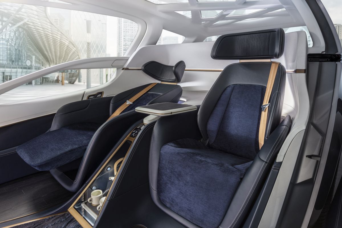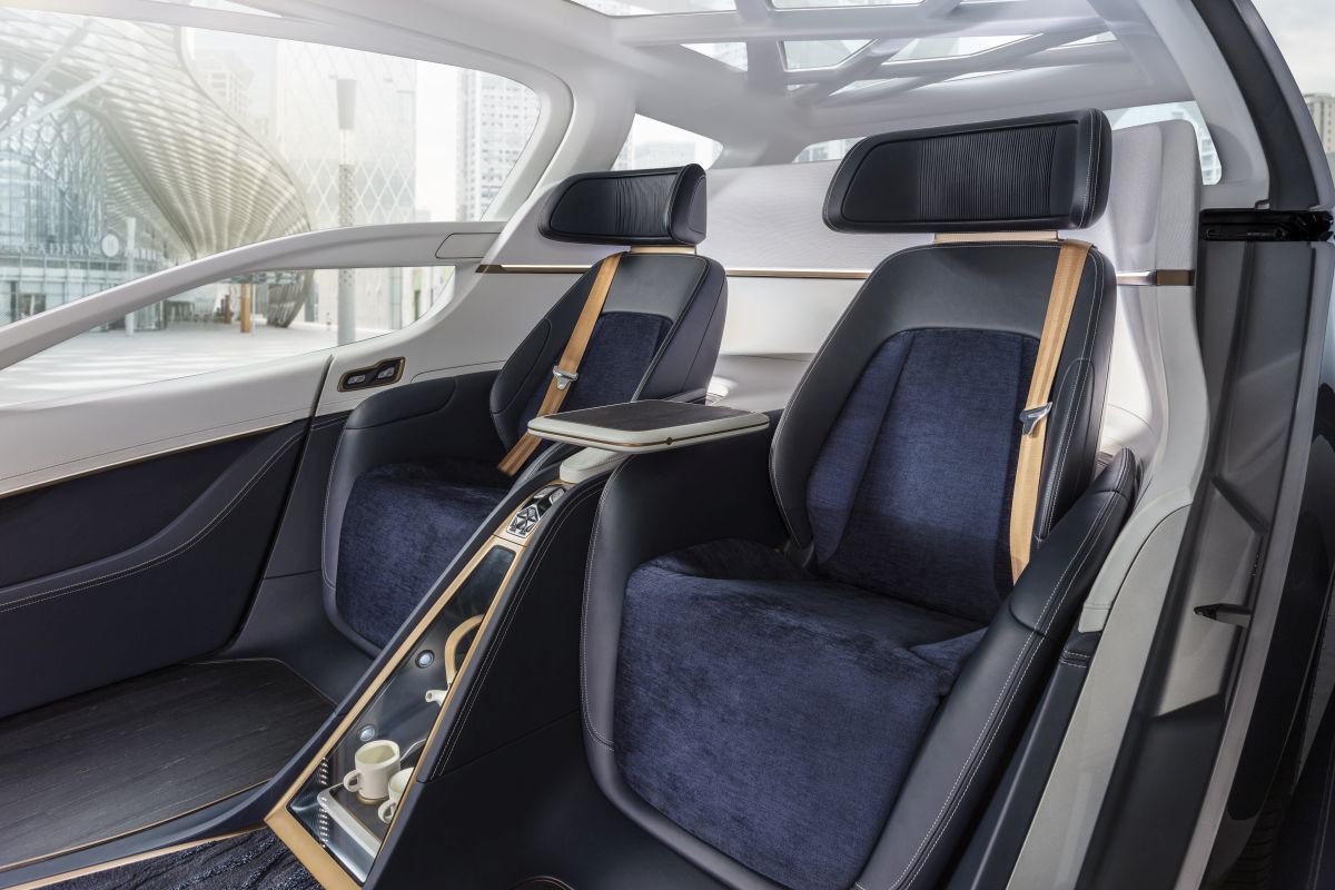 Clean, natural and sculptured details are an essential part of the interior design philosophy. Zero gravity-like lounge seats and a flexible seating layout enable the distinct cabin to serve as an open space for all occupants. Inspired by Chinese mountain and water landscapes, the concept vehicle has an innovative tea tray. It promises a more captivating and comfortable ride that offers a new way for people to interact.