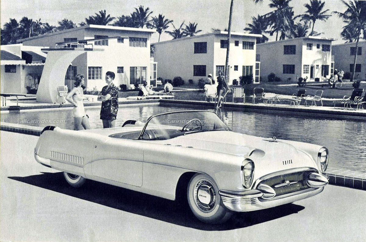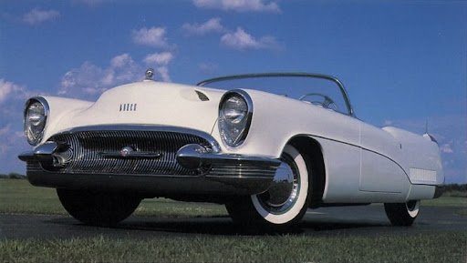 The 1953 Buick Wildcat I was a concept car designed and built primarily to test the use of fiberglass in automobile bodybuilding. Fenderports (used for cooling) were placed on top of the fenders rather than on the sides. The one-piece windshield was a wraparound type with a 60-degree slope to the rear. When the top was down it recessed into the body of the car with a special panel covering it (eliminating the use of a boot)