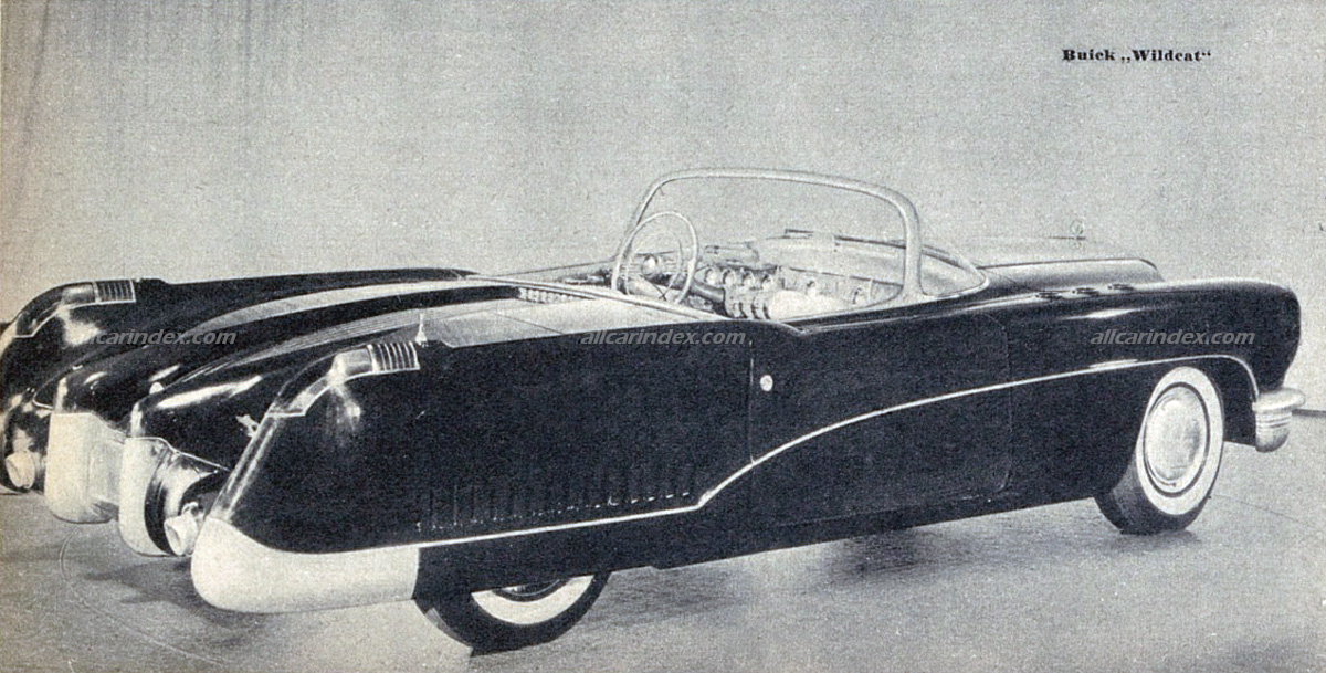 Built as first of two concept cars, the Wildcat was a boulevard cruiser showcasing GM's new drive-line developments.A highlight of the Wildcat was its pioneering Fibreglas body. The same technology was used later in the year to develop the first 1953 Corvette.Stylistic features of the Wildcat included a huge front grill with buffer bomb guards, prominent rear tail fins with build-in lights and a wrap-around front windshield.The Wildcat showcased GM's new Fireball 215 cu.in. V8 that could produce up 188 bhp. This all-aluminum engine turned out to be useful during the fuel crisis of 1956 and was later sold to Rover. In the concept car, this was mated to a new version of GM's torque converter called the Twin Turbine Dynaflow Drive.A unique feature of the car was its front hubcaps which incorporated a technology called 'roto-static brake cooling discs'. These used a cooling duct on the wheel that remained stationary to provide a fresh flow of air to the front brakes.In 1954, a Wildcat II sports car concept was released as a possible companion to the Corvette. A second series of GM concept cars also adopted the Wildcat name in the mid eighties.