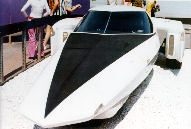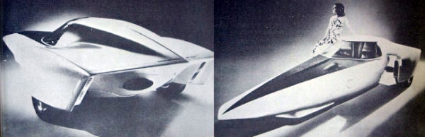 The Astro III vehicle, with its red and black fiberglass body, tapered to a slim nose enclosing twin tires on a common pivot, giving the appearance of a single front wheel. A power-actuated canopy moved forward and upward from the passenger compartment, to give easy entrance and exit to the specially contoured individual seats.