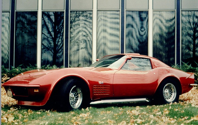 The 1969 Aero Coupe started life as a stock 1968 350 Corvette. It was modified by Bill Mitchell to a show car and used to preview the 1970 1/2 styling changes. The changes he made included a taller windshield, a lift-off one-piece roof, large side exhaust; spoilers, front and rear, cast alloy wheels and cross hatch grille and side vents. The car was painted bright red and at certain times, Mitchell used it the Aero Coupe as his personal ride.