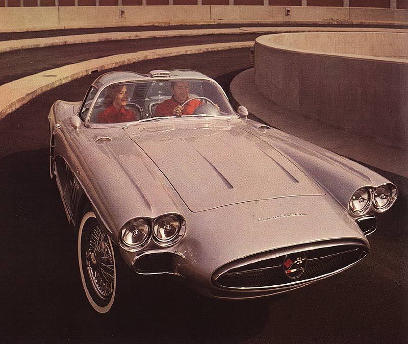 First shown in 1959, the Chevrolet XP-700 was revised in 1960 with a longer and smaller grille, extended tail and double bubble plastic roof, complete with a periscope rear-view mirror. The transparent canopy was like a one-way mirror, passengers could see out, but outsiders would see their own reflections. Originally painted red, the version that appeared during the 1961 Chicago Auto Show was finished in pearlescent silver, which matched the silver cockpit. The exposed side pipes were retained from the 1959 version, as was the rear wraparound bodylines that predicted the design used on the 1961-1962 production Corvette.
