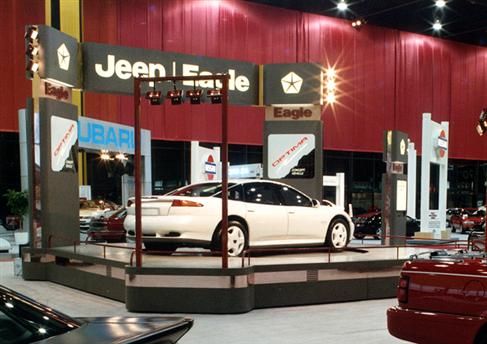 Featuring the cab-forward design philosophy popular at Chrysler Corp. during the 1990s, the Optima concept sedan was the most popular display in the Eagle exhibit area. Its aerodynamic body and custom 5-spoke rims were painted in a 3-coat pearlescent white. Complementing Optima's iridescent exterior, the 5-passenger cabin was upholstered in quartz (light) gray, highlighted by blue accents. Power was supplied to all 4-wheels through an experimental, 32-valve all-aluminum V-8. The 112-inch wheelbase on the Eagle Optima was 1-inch shorter than the 1990 Chrysler Concorde.