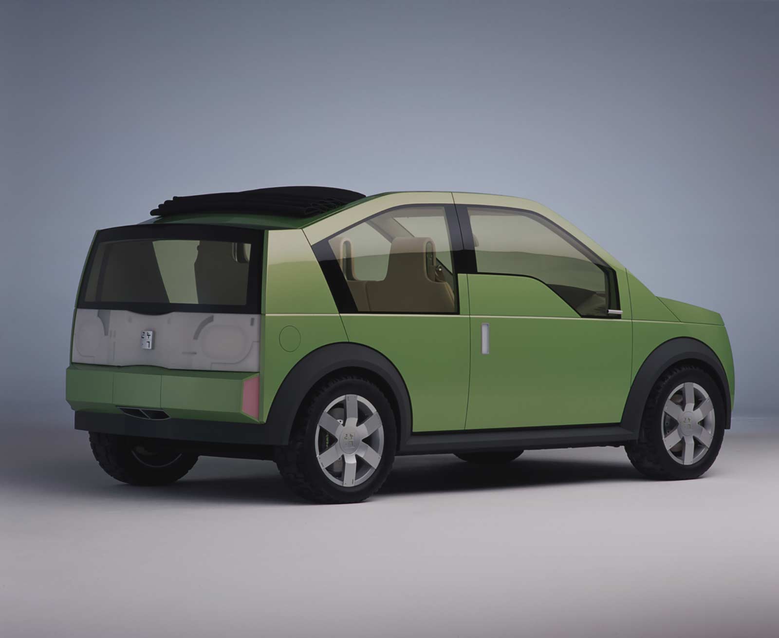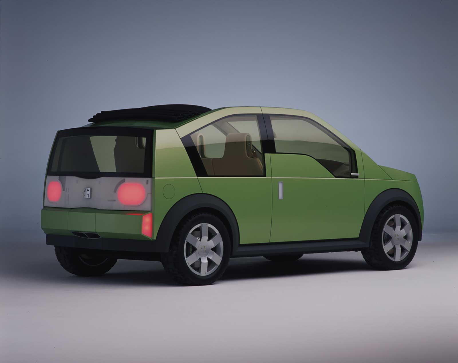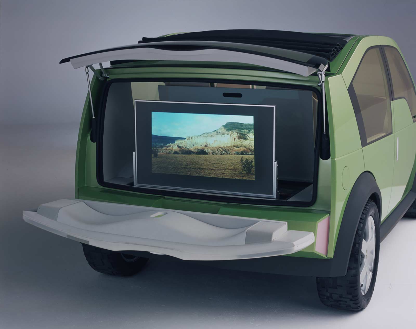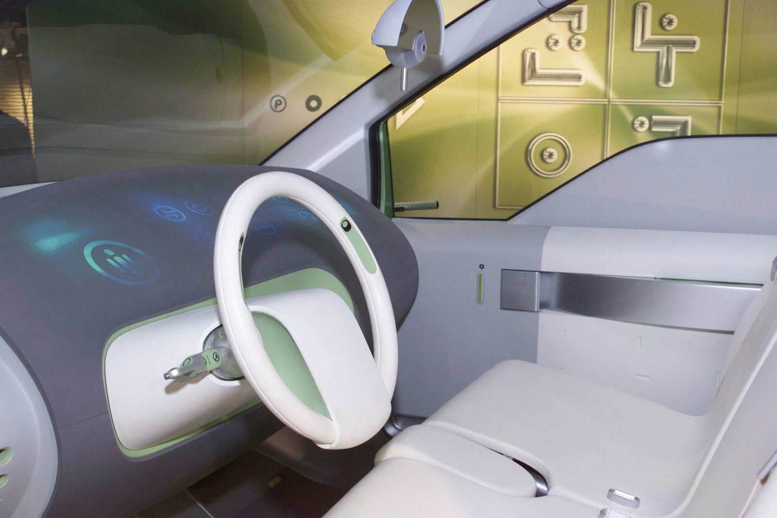 Like the wagon, at the heart of the 24·7 coupe concept are customer-focused technologies that allow the user the ability to access e-mail, hands-free mobile phone, real-time route assistance, weather reports and custom features such as stock readings. "24·7 connects you to your life, because your life doesn't stop when you step into your vehicle," says J Mays, Ford Motor Company vice president of design. "The 24·7 coupe is ideal transportation for people who are constantly moving - whether they are rushing to the next job site or looking for the second or third party of the night." The exterior design, like the wagon, features simple geometric shapes and machined surfaces that give the vehicle a technical look and feel that complement the advanced communications and telematics technologies that make up the essence of 24·7. One of the more prominent features of the coupe is its roof, which is made of a dark green canvas that can be rolled back, giving it the look and feel of a convertible. Like the wagon, the coupe has headlamps and taillamps made up of white and red Light Emitting Diode (LED) lamps that illuminate instantly, last the lifetime of the vehicle and consume only a fraction of the power that traditional halogen lamps require. The 24·7 badge mounted at the center of the composite grille area is lighted green to match the gang green exterior body color. When the key fob is pressed to unlock the vehicle, a light panel mounted in the interior headliner glows green - welcoming the driver into the vehicle. The four-door, four passenger coupe features 17-inch, six-spoke matte aluminum finished wheels wrapped in specially cut 245/50R-17 Goodyear tires with digital patterned tread. The side mirrors have been replaced with "lipstick cameras" that give drivers a panoramic view of their surroundings projected on the surface of the instrument panel. The doors feature elongated rectangular push-button handles. Once the front doors are open, the shorter rear doors can be opened from the center to the back providing unrestricted access to the rear seat area. The interior features specially designed bench-like seats that resemble a clamshell in their construction. The exterior seat surfaces are covered in a light beige leather, while the inner parts of the shell are painted the bright green accent color seen throughout the interior. Exposed parts of the seat structure are finished in aluminum. Both the front and rear benches feature unique center consoles that when raised function as armrests and reveal cupholders. The rear seat can be removed from the interior and used as a bench outside the vehicle. A large rear projection screen, mounted at the back of the cargo area, can be used to show movies or music videos. When not in use, the projection screen is stored under the floor of the rear cargo area. Like the wagon, the coupe's instrument panel is a high-definition projection screen. Once the vehicle has been powered up and the driver has been selected, the gauges appear on the instrument panel in the ideal configuration for the specific driver. Using voice commands, the driver is able to choose which gauges are active when needed. The available choices include speedometer, oil, fuel, GPS/map, Internet, e-mail, mobile phone, compact disc/tape/radio and clock. All the operations are voice activated, allowing the driver to keep both hands on the wheel. 24·7's one-spoke steering wheel includes the control for the auto/manual shift, which allows the driver to shift gears by pressing a button. In addition, the voice activation button is mounted on the opposite side of the steering wheel. A camera mounted below the rearview mirror can be positioned to transmit images of the driver and passengers while in the vehicle and using the hands-free videophone. The coupe floor is covered in rubber matting that has a unique pattern with randomly alternating circular shapes in the bright green accent color. 24·7 is built on the all-new Ford Focus platform that has been lengthened two-inches. It is powered by Focus' 2.0-liter Zetec I-4 engine.