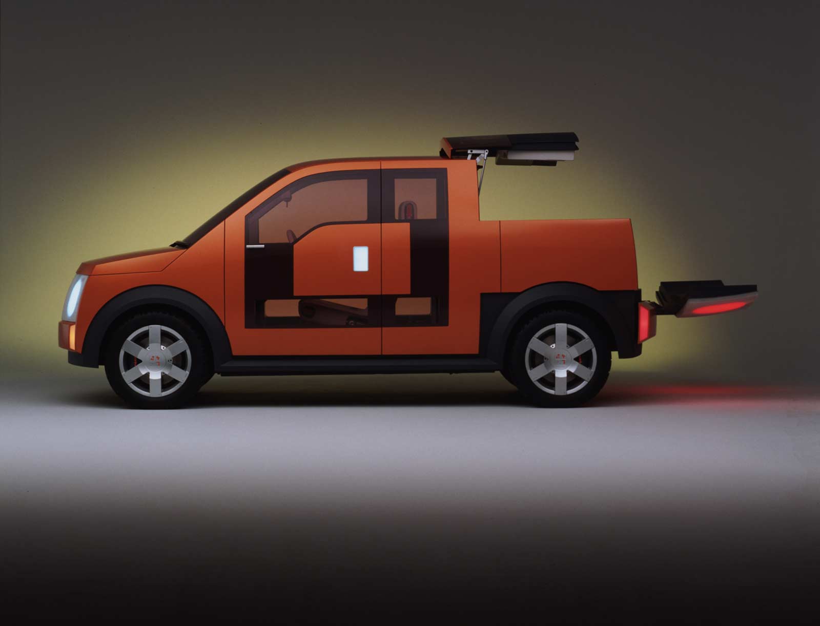 The 24·7 concept pickup is ready for any adventure its occupants desire - whether it is climbing rocks by day or listening to a favorite band at night. "The 24·7 pickup is designed to be like a backpack," says J Mays, Ford Motor Company vice president of design. "It can be loaded up with all of the necessary adventure gear for a weekend out in the wilderness, or you can fill it with books and roam around campus during the week." Like the wagon, the pickup concept features customer-focused technologies that allow the driver of the vehicle the ability to access e-mail, hands-free mobile phone, real-time route assistance, weather reports and custom features such as stock readings. "The 24·7 pickup is not just a truck that can take you where you need to go," Mays adds. "It is your connection to the world - a companion to help you explore its endless possibilities." The technology in 24·7 allows the driver to personalize the instrument panel to suit his or her personality and needs. Voice technology coupled with a reconfigurable projected image display - developed by Visteon Automotive Systems - gives each driver the ability to customize the instrument panel by changing the layout of the gauges and engaging additional functions, such as e-mail, GPS and video phone as needed. The pickup's exterior design, like the wagon, features simple geometric shapes and machined surfaces that give the vehicle a technical look and feel that complements the advanced communications and telematics technologies that make up the essence of 24·7. The two-door, two-passenger pickup truck features 17-inch, six-spoke matte aluminum finished wheels wrapped in specially cut 245/50R-17 Goodyear tires with digital patterned tread. The side mirrors have been replaced with "lipstick cameras" that give drivers a panoramic view of their surroundings projected on the surface of the instrument panel. The doors feature elongated rectangular push-button handles and additional glass panels that allow for increased driver visibility. Once the front doors are open, the half doors at the rear can be opened from the center to the back, providing unrestricted access to the rear of the cab. The headlamps and taillamps are made up of white and red Light Emitting Diode (LED) lamps that illuminate instantly, last the lifetime of the vehicle and consume only a fraction of the power that traditional halogen lamps require. The 24·7 badging mounted at the center of the grille area is lighted orange to match the exterior oracle orange body color. When the key fob is pressed to unlock the vehicle, a light panel mounted in the interior headliner glows orange - showing that this pickup is always ready for any adventure. The interior features specially designed bench seats that resemble a clamshell in their construction. The exterior seat surfaces are covered in a light beige leather while the inner parts of the shell are painted the bright orange accent color seen throughout the interior. The parts of the seat structure that are exposed are aluminum finished. The bench features a unique center console that, when raised, functions as an armrest and reveals a cupholder. Like the wagon, the pickup instrument panel is a high-definition projection screen. Once the vehicle has been powered up and the driver has been selected, the gauges appear on the instrument panel in the ideal configuration for the specific driver. Using voice commands, the driver is able to choose which gauges are active when needed. The available choices include: speedometer, oil, fuel, GPS/map, Internet, e-mail, mobile phone, compact disc/tape/radio and clock. All the operations are voice activated, allowing the driver to keep both hands on the wheel. 24·7's one-spoke steering wheel includes the controls for the auto/manual shift feature that allows the driver to shift gears by pressing a button. In addition, the voice activation button is mounted on the opposite side of the steering wheel. A camera mounted below the rearview mirror can be positioned to transmit images of the driver and passengers while in the vehicle and using the hands-free videophone capabilities. The pickup's floor, like the wagon, is covered in rubber matting that has a unique pattern with randomly alternating circular shapes in the bright orange accent color. 24·7 is built on the all-new Ford Focus platform that has been lengthened two-inches and is powered by Focus' 2.0-liter Zetec I-4 engine.