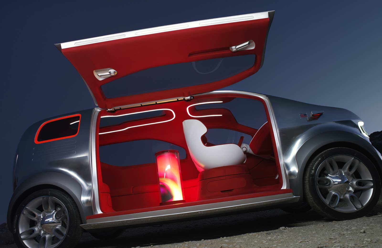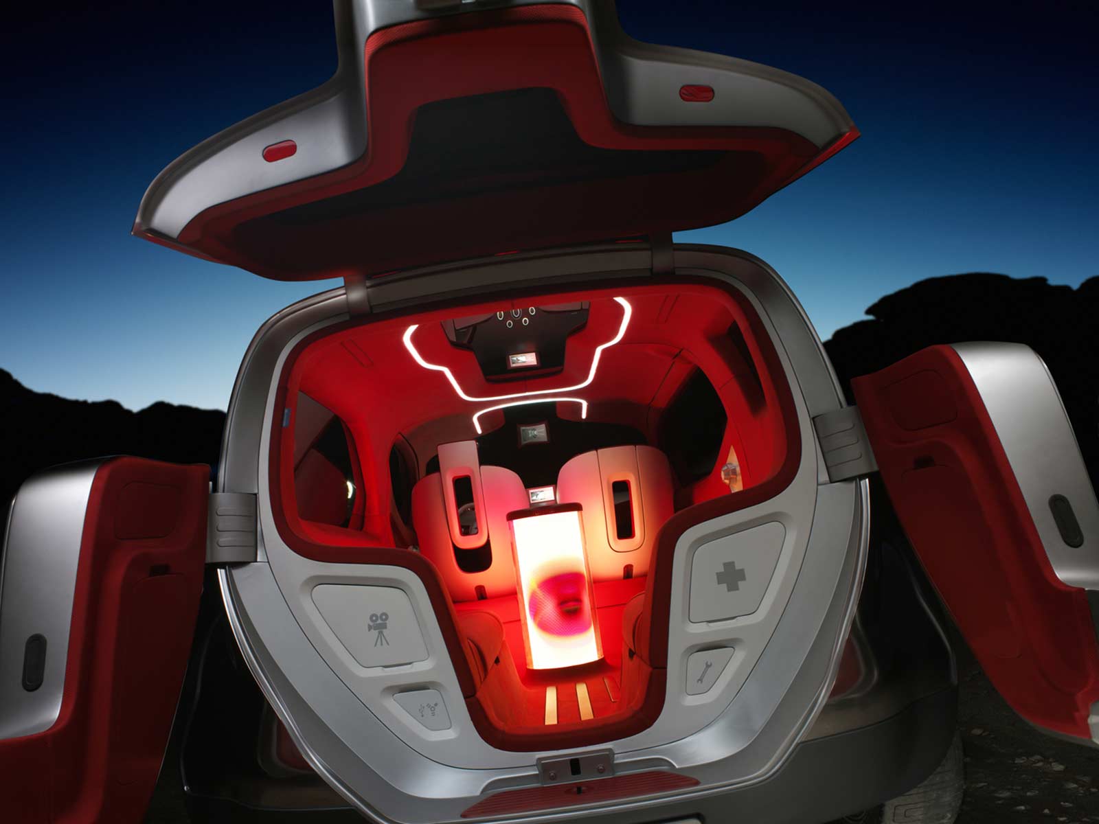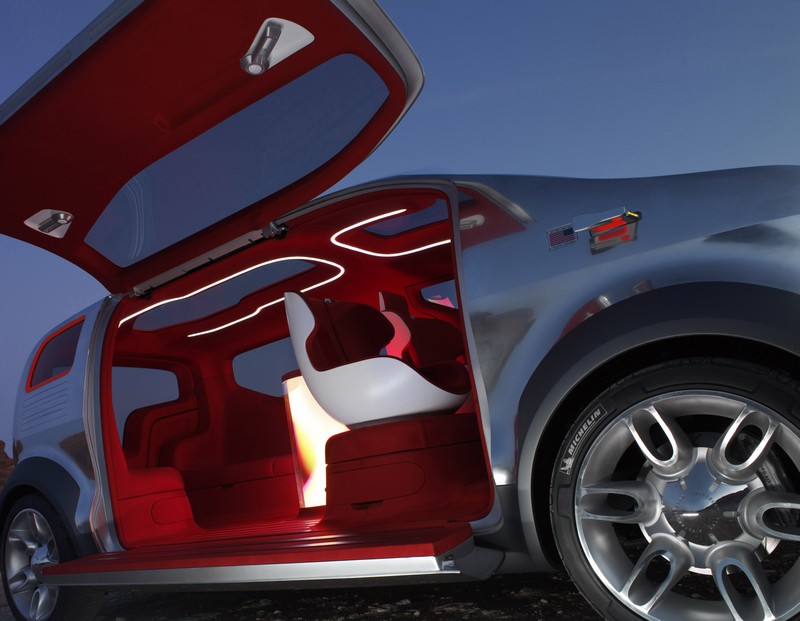Its doors are asymmetric as well, allowing for easy loading of passengers and cargo. In addition to the driver’s side hatch, the passenger side features a power clamshell door that runs two-thirds the length of the vehicle. A three-door hatch finishes the rear of the crossover.