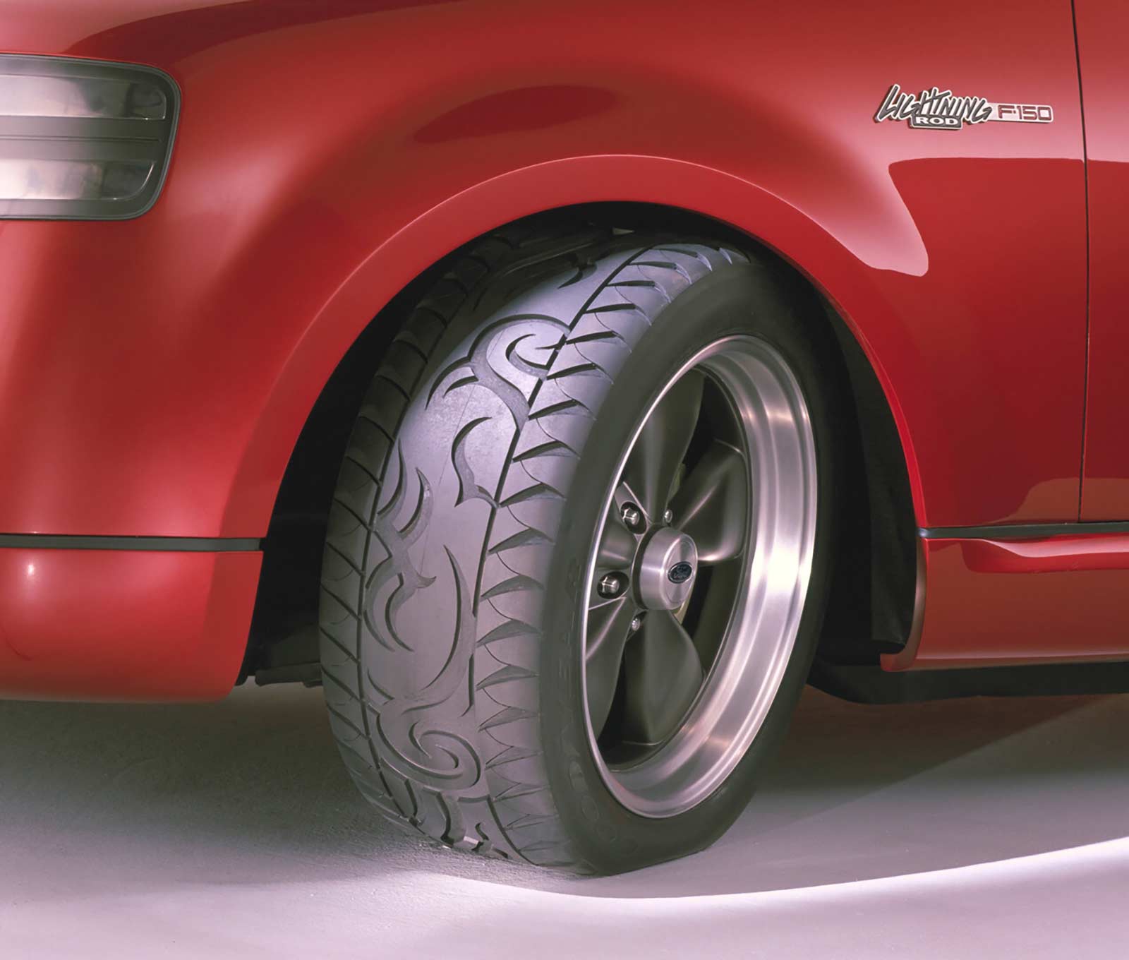 Lightning Rod's strong wheel arches house custom Goodyear - 295/40 R20 tires in the front and 305/40 R20 tires in the rear - which carry the Maori tattoo theme to the treads. The rear tires are slightly bigger, supporting the hot rod feel of the pick-up. The five-spoke custom-designed 20-inch cast aluminum wheels are a medium gray, satin finish.