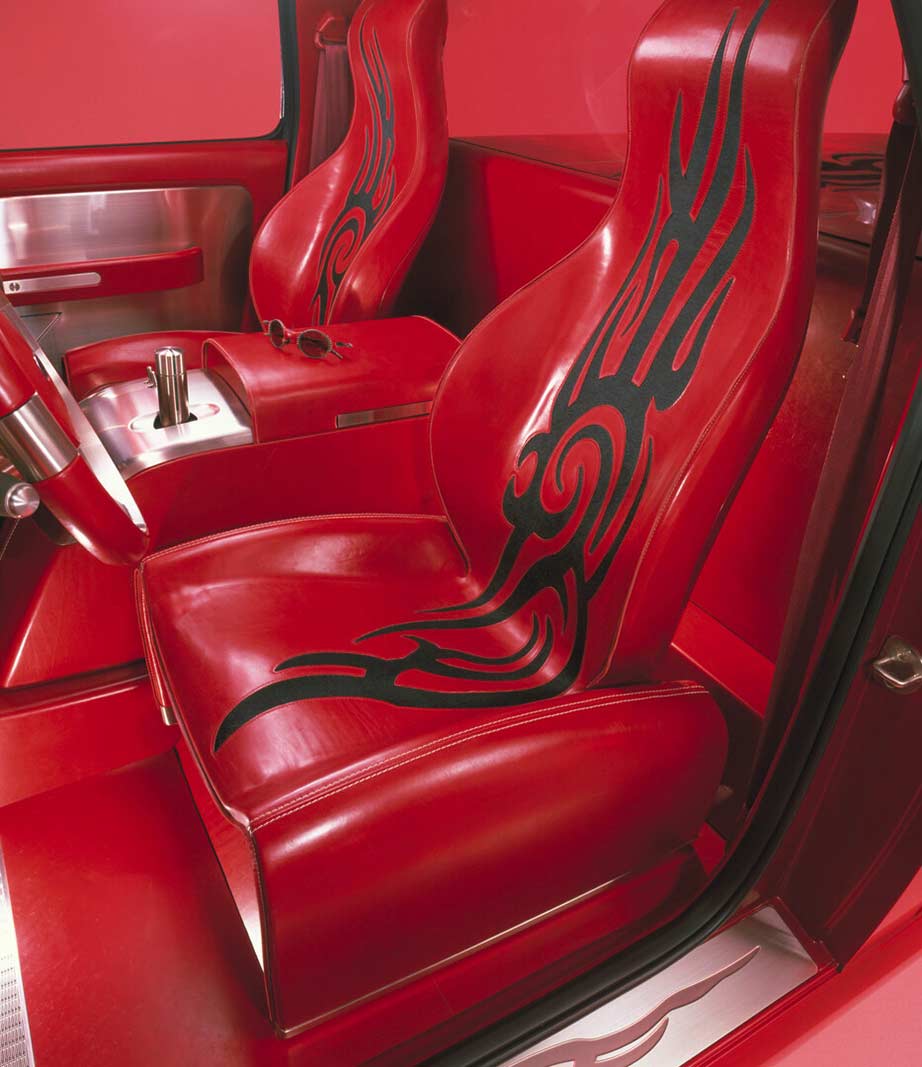 The Maori tattoo theme is carried through to the leather-wrapped bucket seats and headliner. The die cut pattern is filled in with the same black cow hair as the tonneau cover.