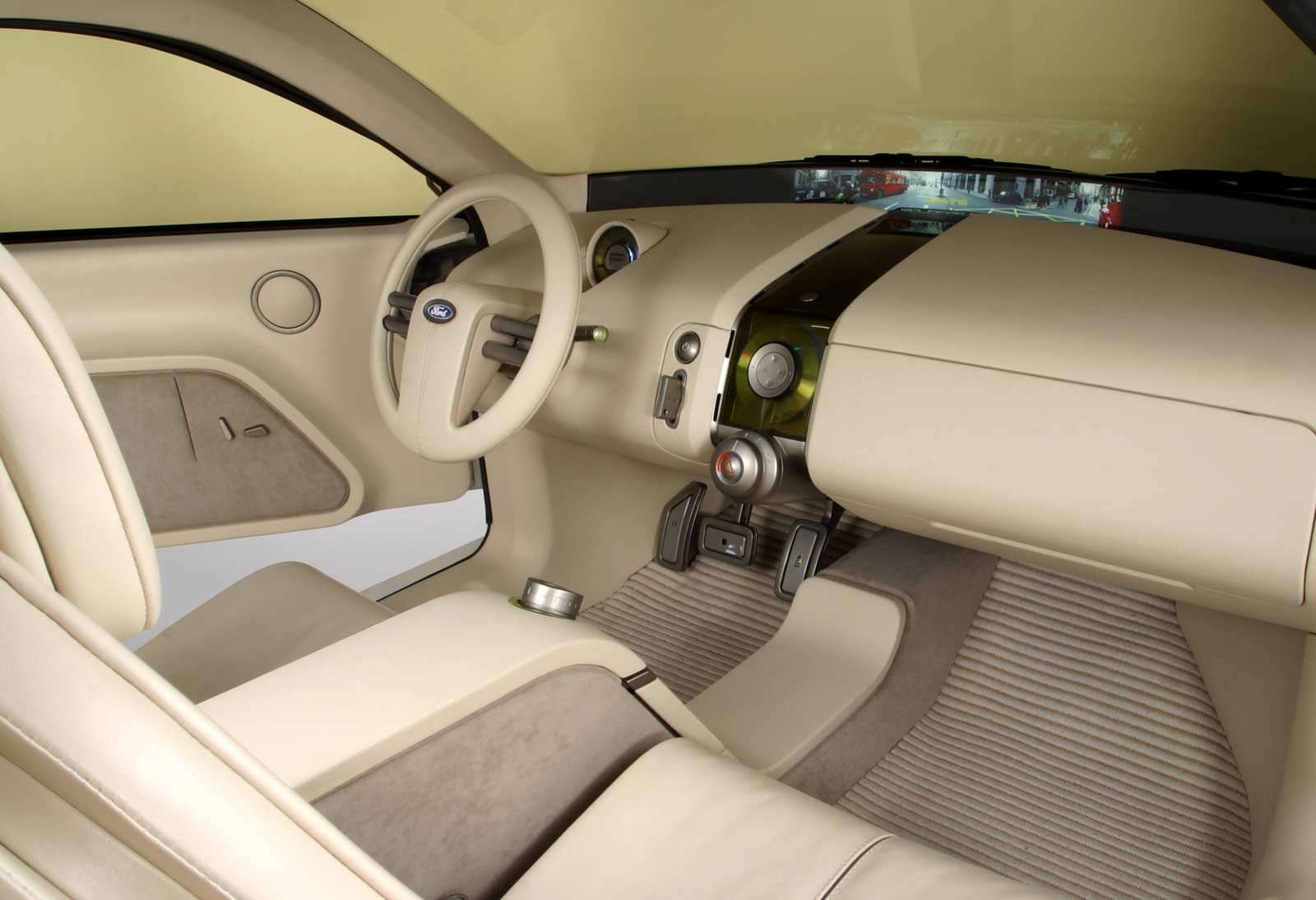 Multiple cameras take images from strategically placed interior and exterior locations – and make urban parking a whole new, easier experience. The images are displayed on three screens at the base of the windshield. The driver has a choice of a panoramic rear view, a close-up view directly behind the vehicle, a security scope, or the entertaining antics of other passengers.