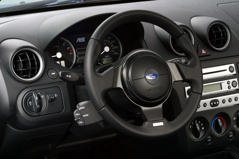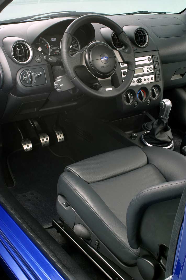 Its wide, hunkered stance with 18-inch JWRC-inspired alloys and low-aspect performance tyres sitting in generously extended wheelarches immediately communicate the performance purism you would expect from an RS-badged Ford. The wheel track measures just 20 mm narrower than the ultra-wide JWRC's stance, and the suspension is overtly sporting, reflecting an insatiable appetite for curves.