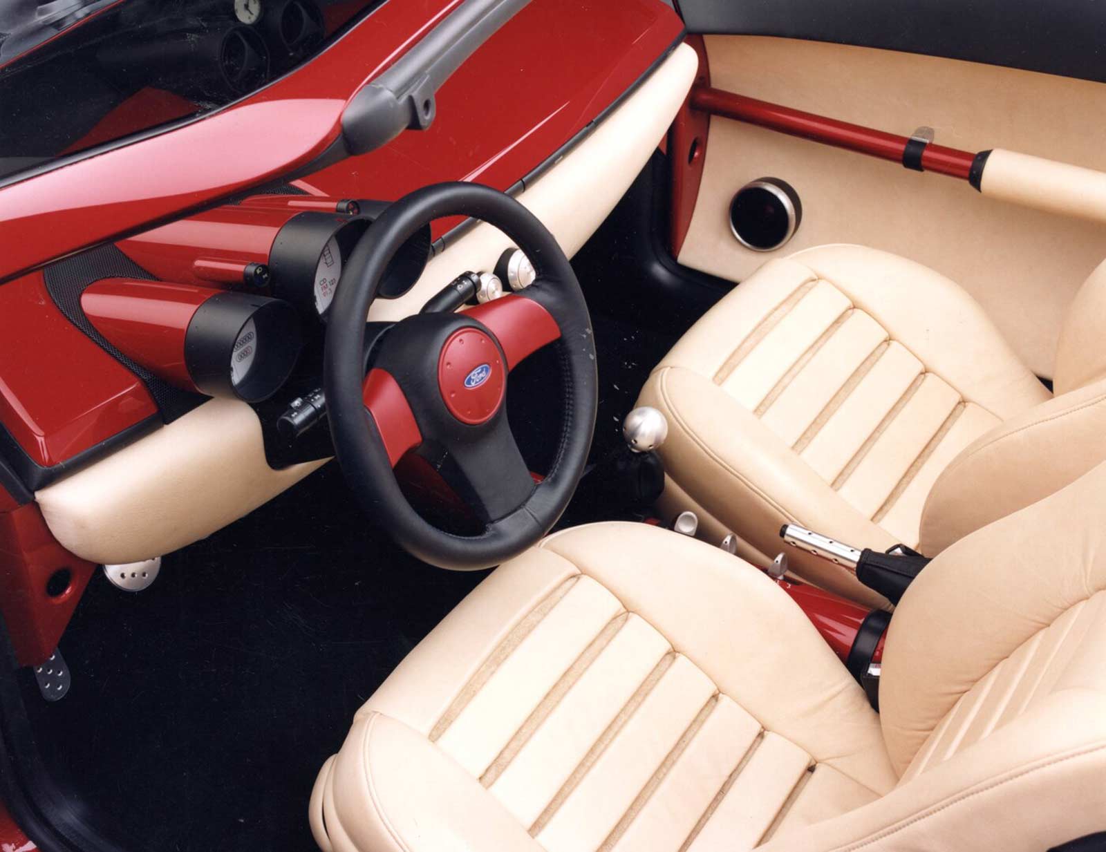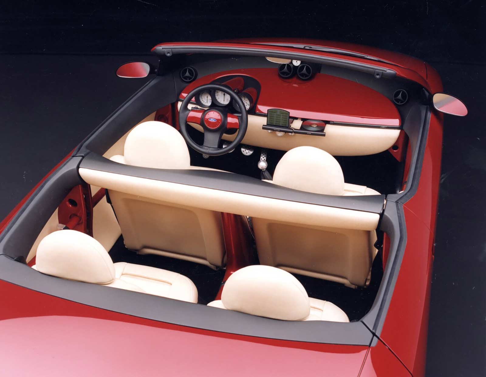 The top half of the dash board is finished in the same red paint as the exterior and includes four air-registers, that feature the same design as those found in the new Mercury Cougar, as well as an analog clock in the center. The bottom half is covered in cream colored leather to match the doors and seats and includes the control knobs for the radio/CD unit as well as a pop-up messaging center and a compact disc storage compartment.