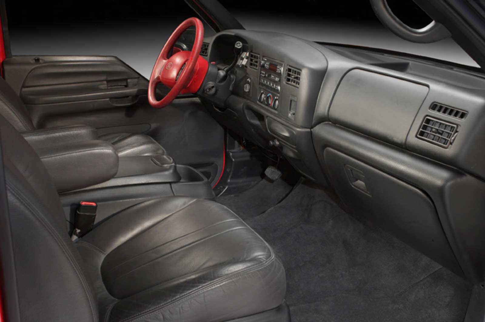 The truck's bright red exterior is accented with touches of chrome and gray. Its black interior features leather seating surfaces, a bright red leather-trimmed steering wheel, and black-on-white instrument panel gauges.