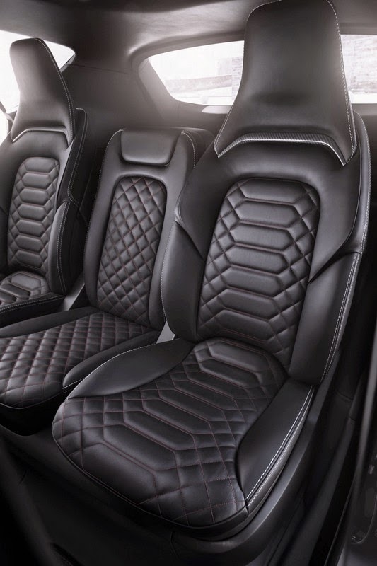 The seats feature a new variation on the quilting effect first demonstrated in the Mondeo Vignale Concept. Front seats and outer rear seats feature hexagonal quilting bordered with square quilting that stretches across the centre-rear seat and front armrest. “Tone-on-tone” stitching with thick dark red thread highlight the seat centres and is complemented by lighter exterior thread at the seats’ perimeters.