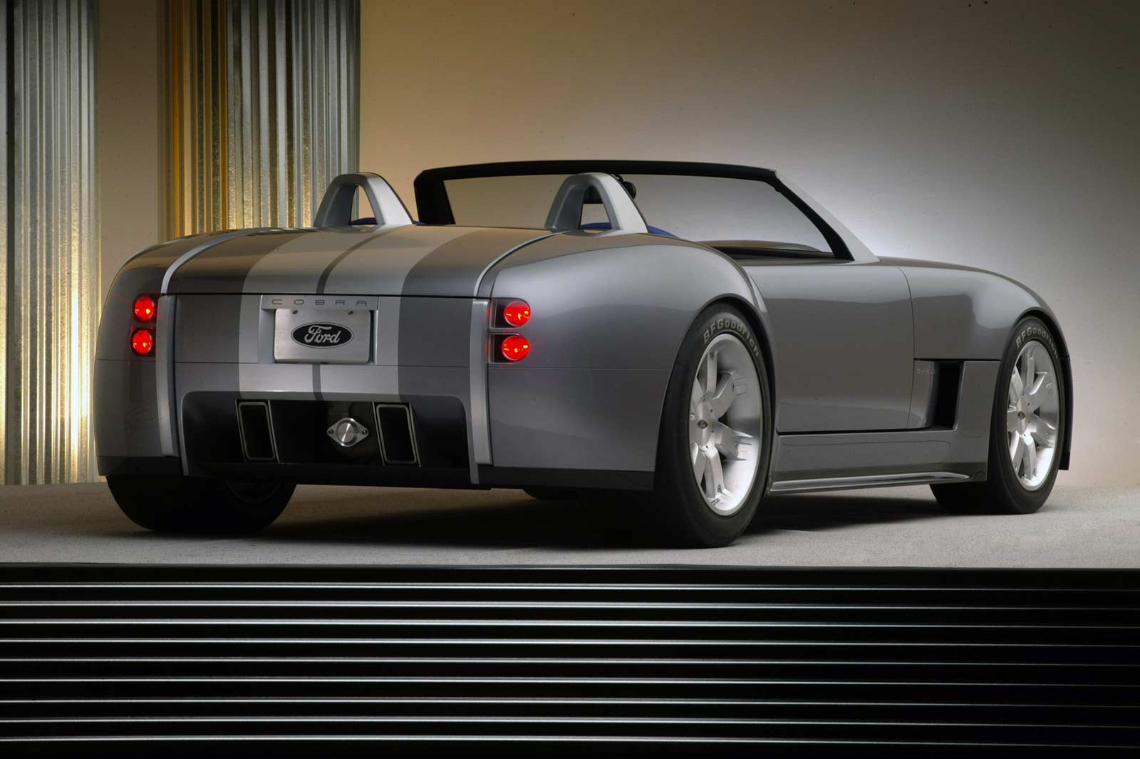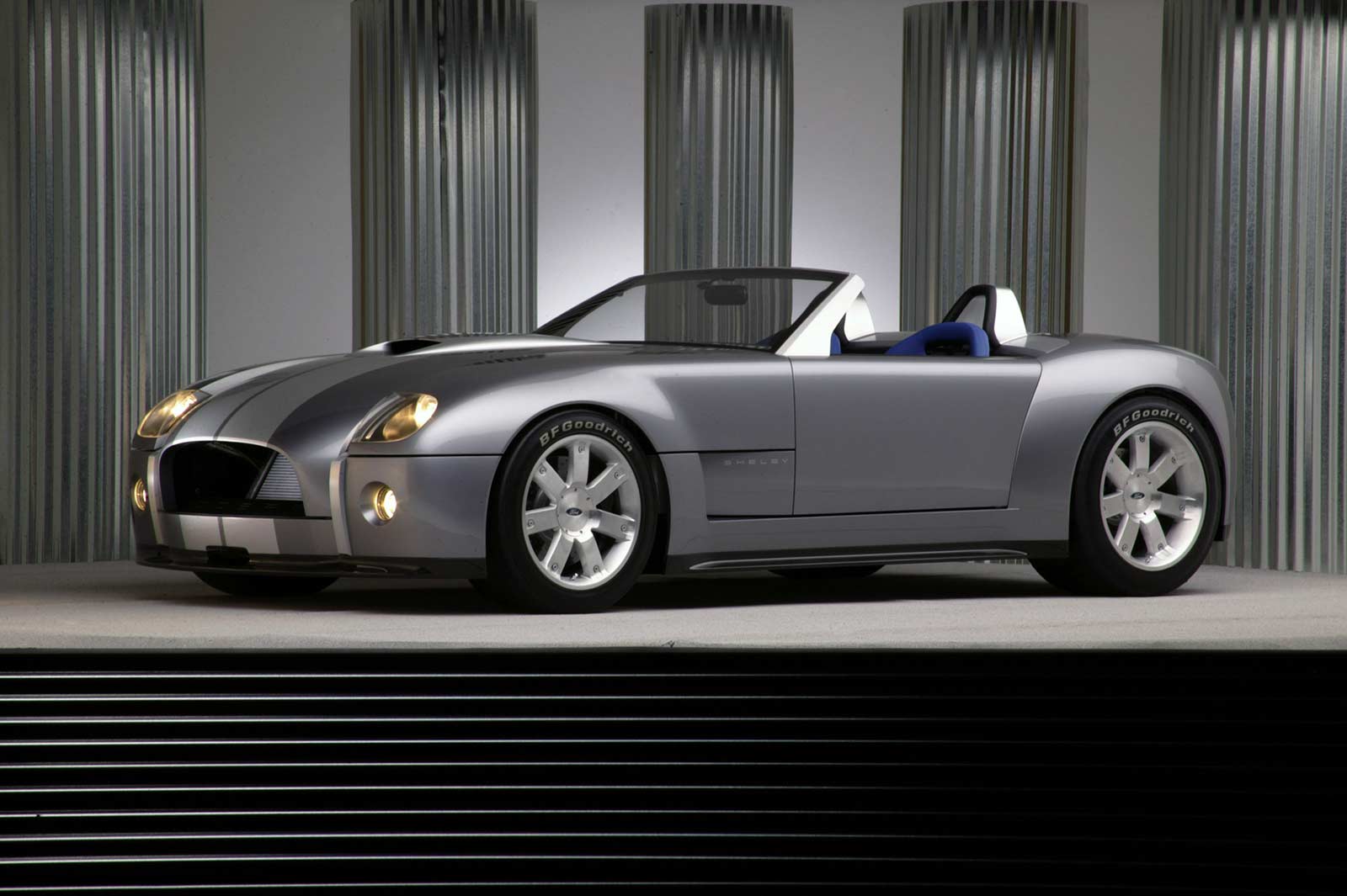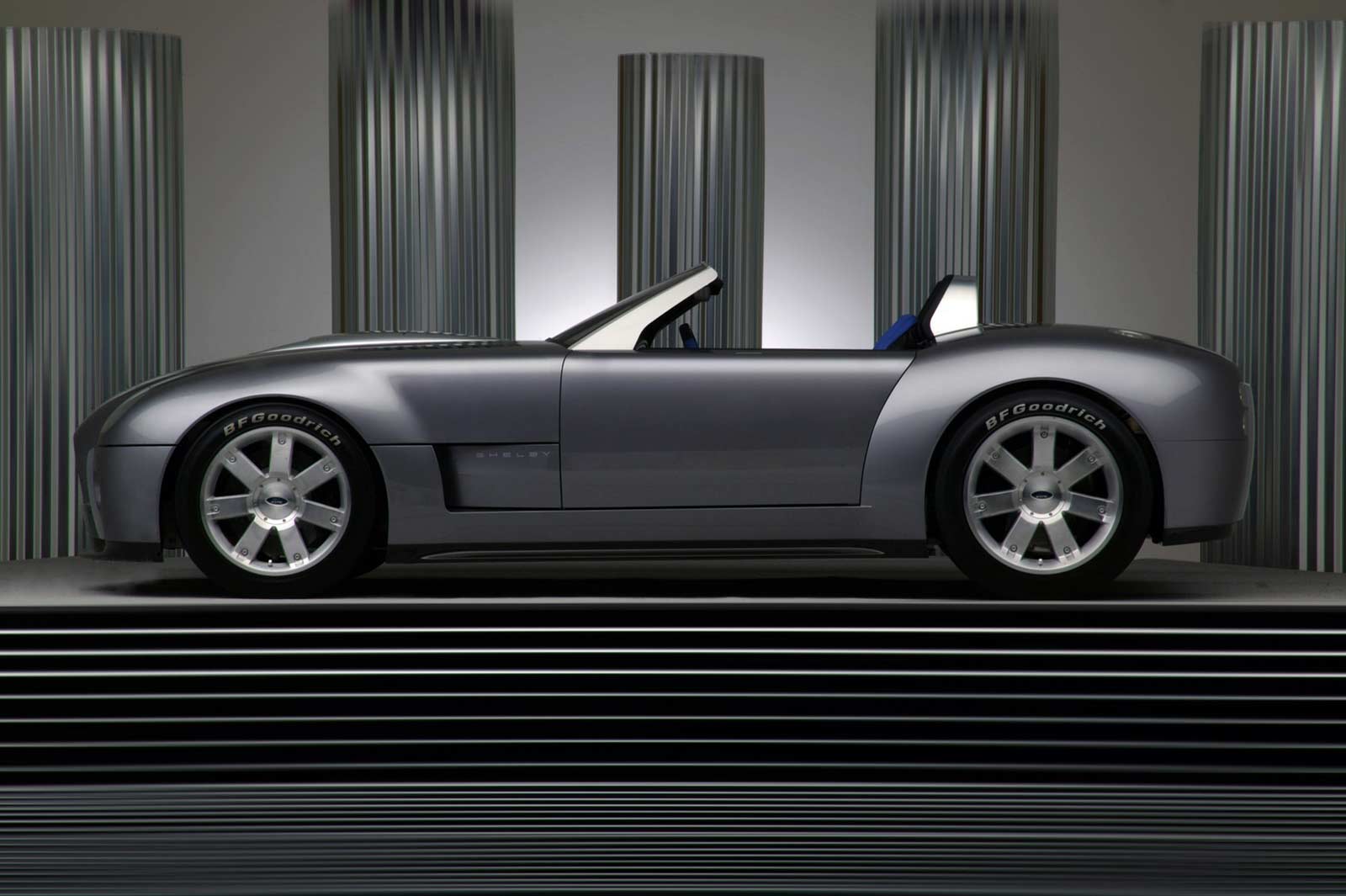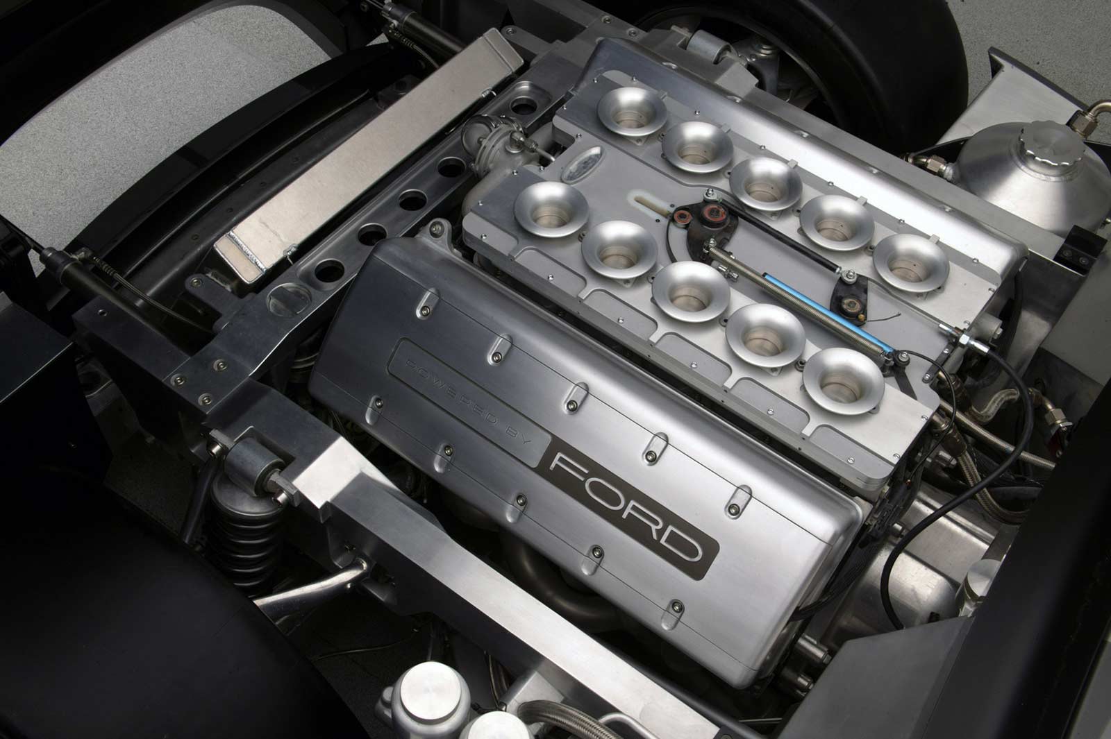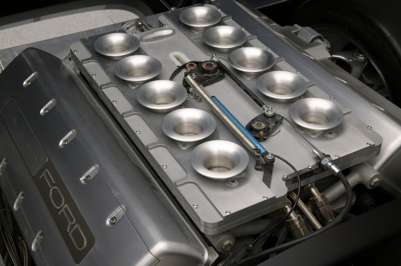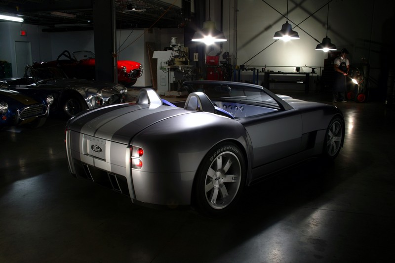 This production-feasible roadster has a 427-inspired 605-horsepower, all-aluminum V-10 engine mounted at the front of an advanced aluminum chassis modified from the rear-engine Ford GT.