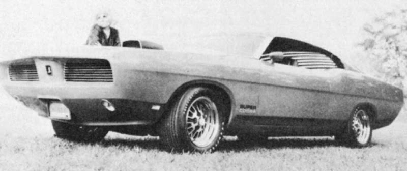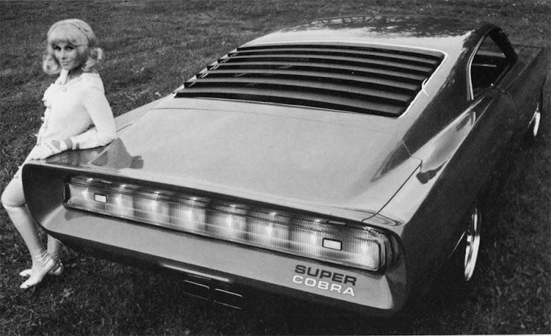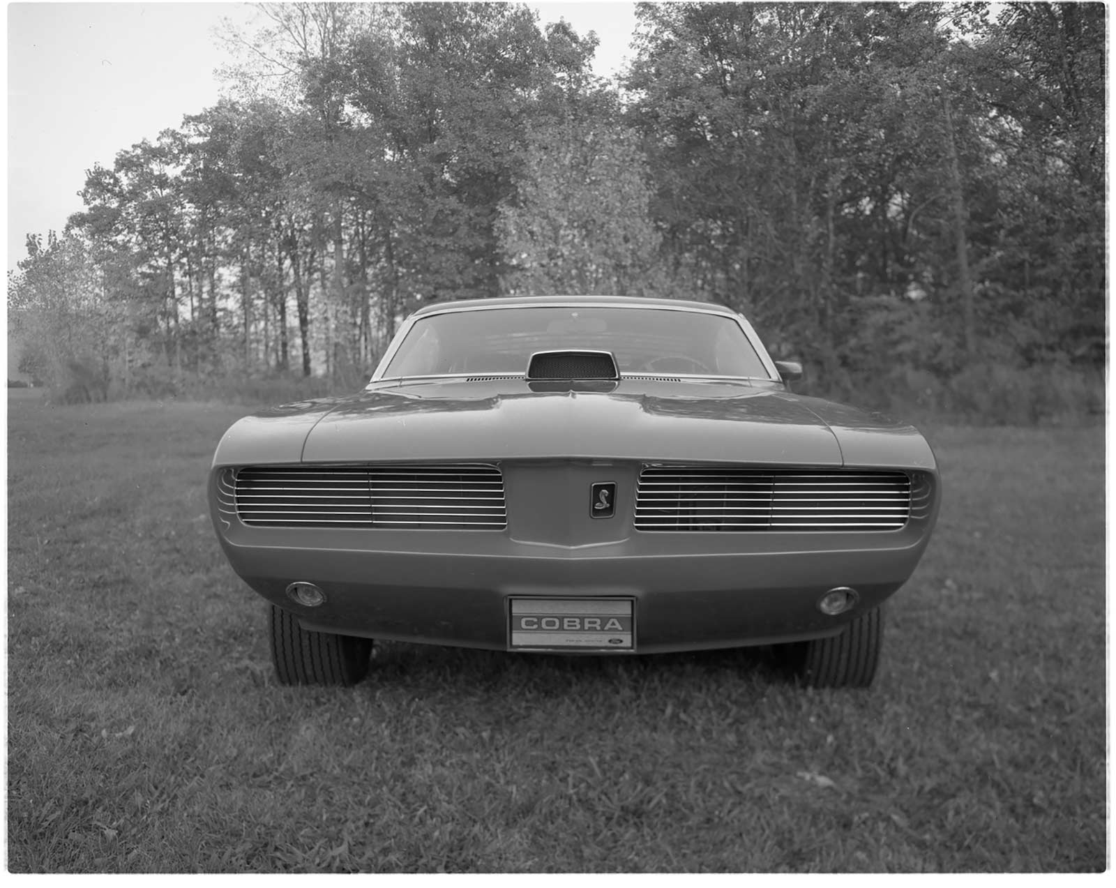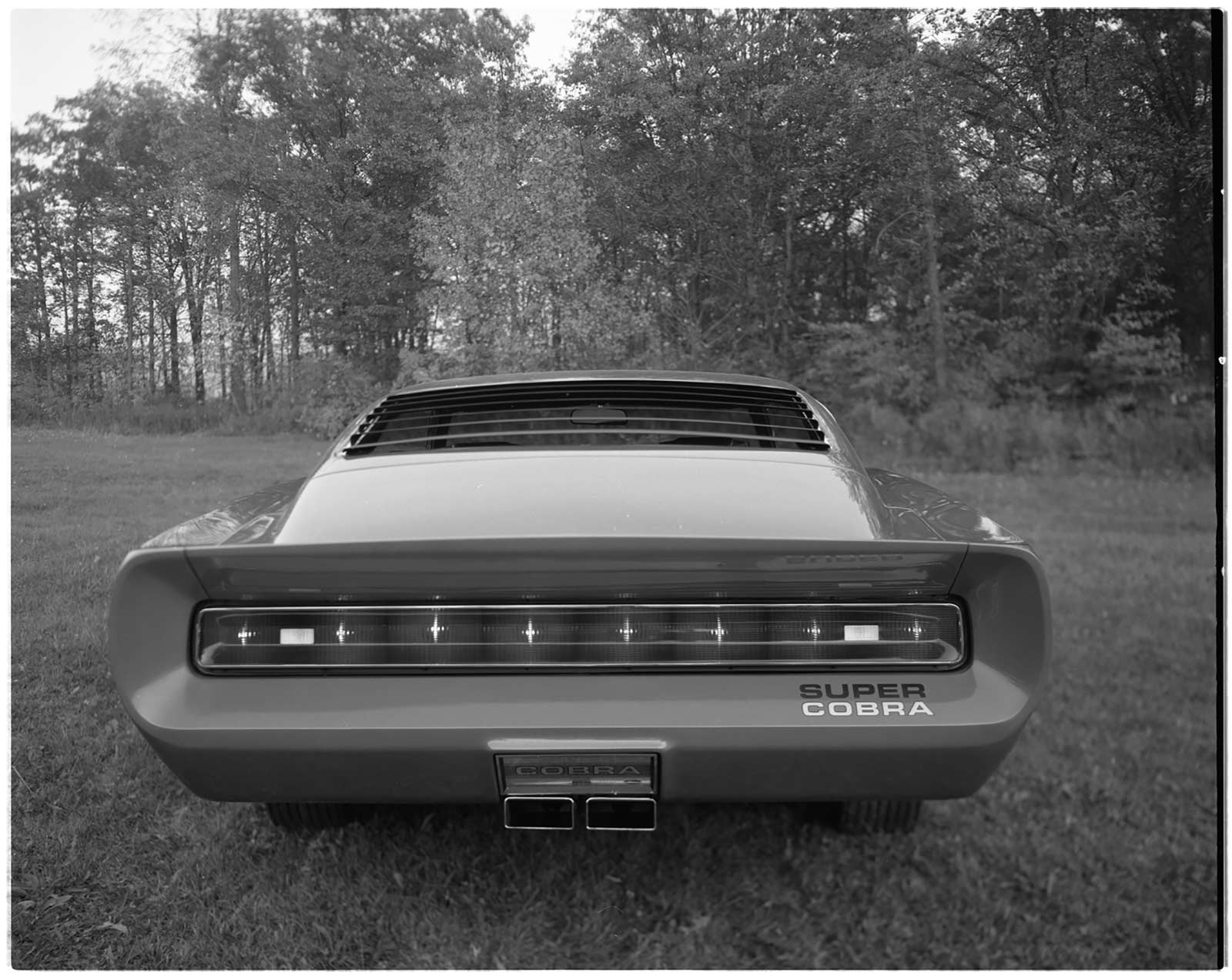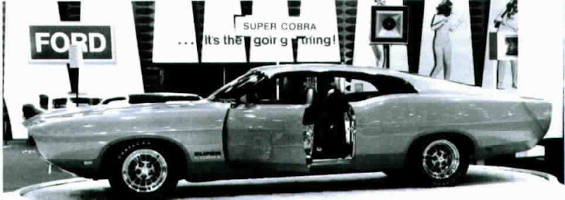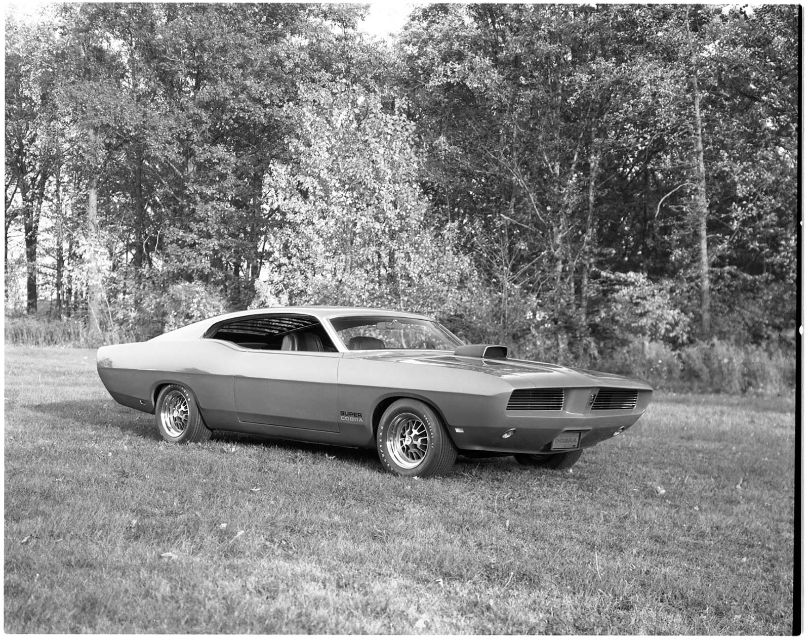 Starting with a 1969 Fairlane, the Super Cobra SportsRoof show car was lowered two-inches and the front clip was stretched by eight-inches. Concealed headlights, wall-to-wall taillights, black metal louvers, and slant back windshield added to the racy exterior. The high performance 428 cubic inch V-8 engine powered the Super Cobra, and featured a tall shaker air scoop that poked through the hood. Custom interior was finished in candy-murano and hot red to compliment the red exterior.