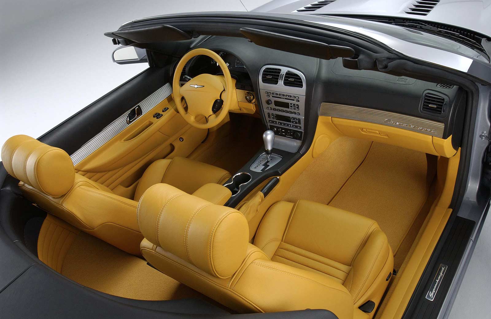 The stunning interior of the SVT Lightning concept perhaps best illustrates the benefits of adapting F-150’s modular design architecture. It builds on the craftsmanship and meticulous detailing of the all-new 2004 F-150, according to Jim Smithbauer, F-150 design manager. “The luxurious Lariat interior was a perfect starting point for the SVT Lightning concept,” Smithbauer says. “The color and trim emphasize the SVT Lightning concept’s aggressive character, while the seat bolsters and console-mounted shifter make the perfect cockpit for the performance enthusiast. The dash and center console are accented with Liquid Silver Metallic to match the exterior. The seats are covered in Mustard Yellow leather, complemented by Ebony carpet and door trim. Even subtle changes emphasize performance, like the red engine start button and the electro-luminescent gauges — an SVT trademark.” Another emphasis on performance is the manual gearbox instead of the top-of-the-line F-150 Lariat’s automatic transmission. Most pickups with a manual transmission have shifters mounted on the floor. The SVT Lightning concept employs a flow-through center console, enabling a short-throw shifter reminiscent of a sports car.