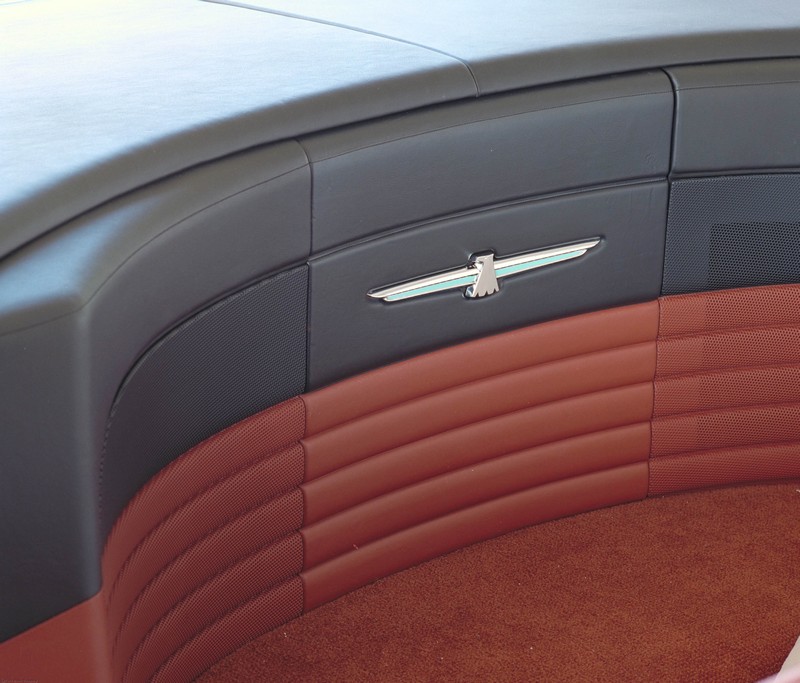 The interior features a two-tone theme with sienna and ebony leather, set off by engine-turned aluminum accent panels. Gaffka chose Dräxlmaier Automotive of America to craft the custom interior parts. From the moment the door is opened, virtually every place the driver or passenger looks and touches in the car has been customized. The doorsill plate is wrapped in a thin layer of sienna leather with an opening in the middle exposing the Thunderbird logo etched in aluminum. The door panels feature sienna leather armrests and upper sills with engine-turned aluminum accents.