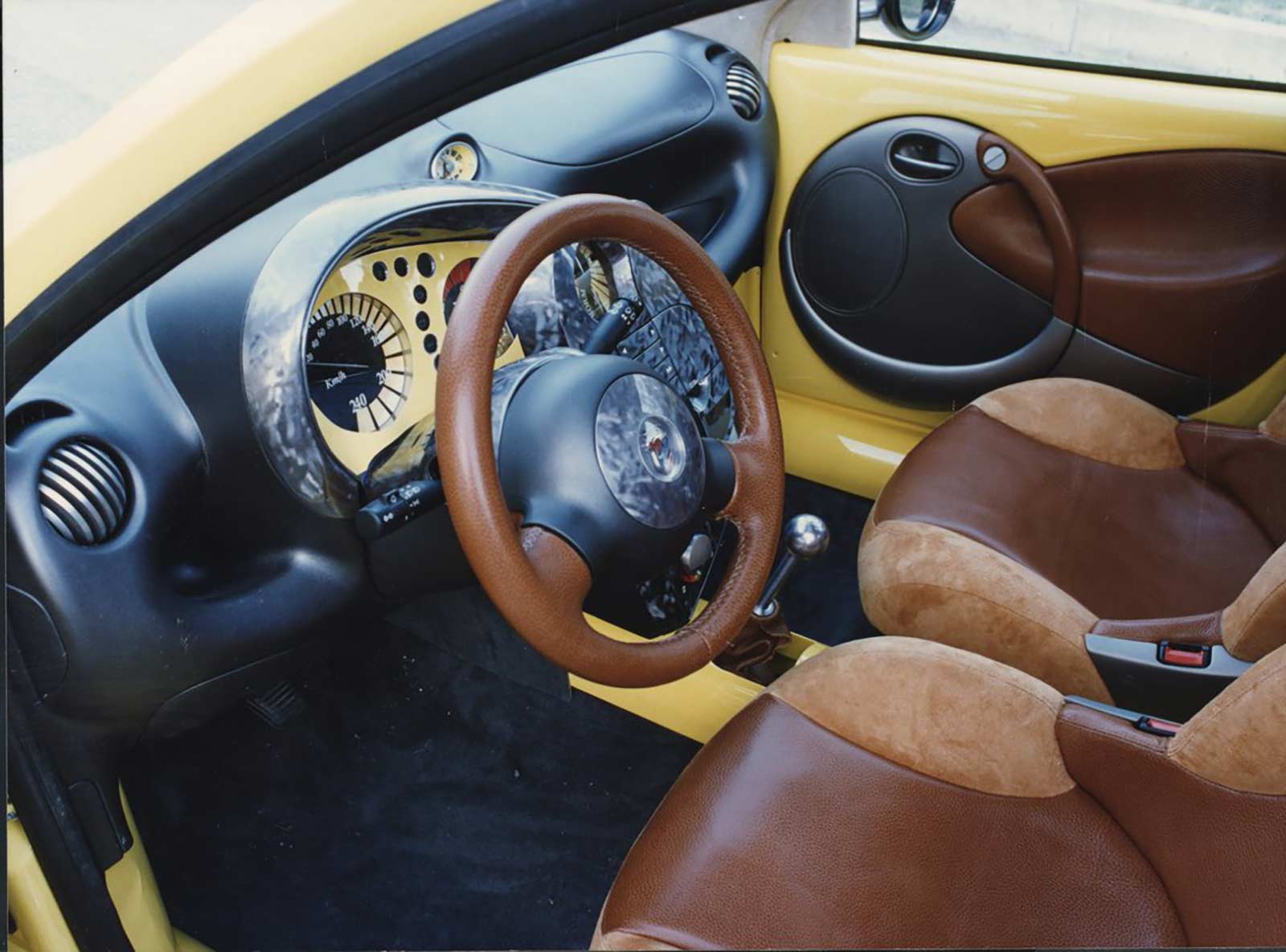 A further two years brought Ghia's elaboration on Ka's concept, the Turing Ka, its name cleverly typeset to emphasize Ghia's Turin heritage. Ghia Turing Ka concept's design recognized that environmental impact was only one factor to Ka buyers' environmental concerns. Another was the ability to enjoy the natural environment their activism was preserving. Ghia Turing Ka is loaded with natural textures and materials. The four bucket seats are upholstered in suede leather accented with grained leather trim which extends even to the luggage compartment. Even the headliner and sun visors are beige suede-like material. It is provided with matching blue cloth and suede soft luggage, boldly embroidered with Ghia's Turing Ka logo.