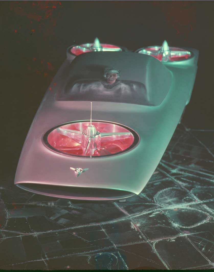 Named the Volante, the model is not operable but represents a design concept of a vehicle that might be capable of operating either in the air or on the ground. The tri-athodyne concept calls for ultra-sophisticated use of the ducted fan principle, employed in a unique manner.