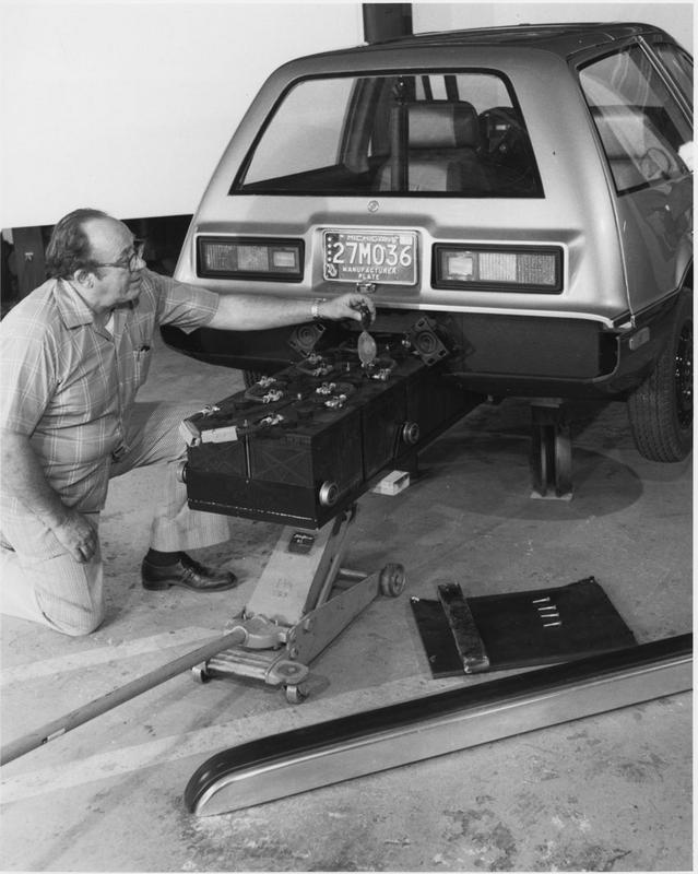 The four-passenger test vehicle - announced in September 1978 - was designed "from gound up" to achieve top performance from off-the-shelf components and battery systems now commercially available in the marketplace. In honor of GE's 100th birthday, which the company celebrated in 1978, the sleek, two-toned blue vehicle has been named the "Centennial Electric".