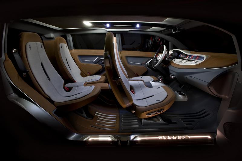 The Granite’s comparatively short body length is complemented by a wide, 70.3-inch (1,786 mm) overall width and a tall, 60.5-inch (1,536 mm) height. Those dimensions create unique proportions that depart dramatically from conventional minivan, SUV or crossover designs. “The Design team leveraged the best attributes from different segments: SUV, minivan and crossover, and mixed them with a commercial chic aesthetic. We feel this redefines the premium class of vehicles we call urban utility vehicles,” said Lyon.